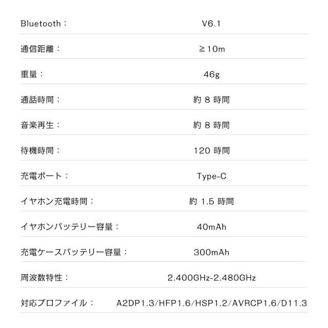パッケージリスト:イヤホン本体/充電ケース/Type-C充電ケーブル/ストラップ/日本語取扱説明書