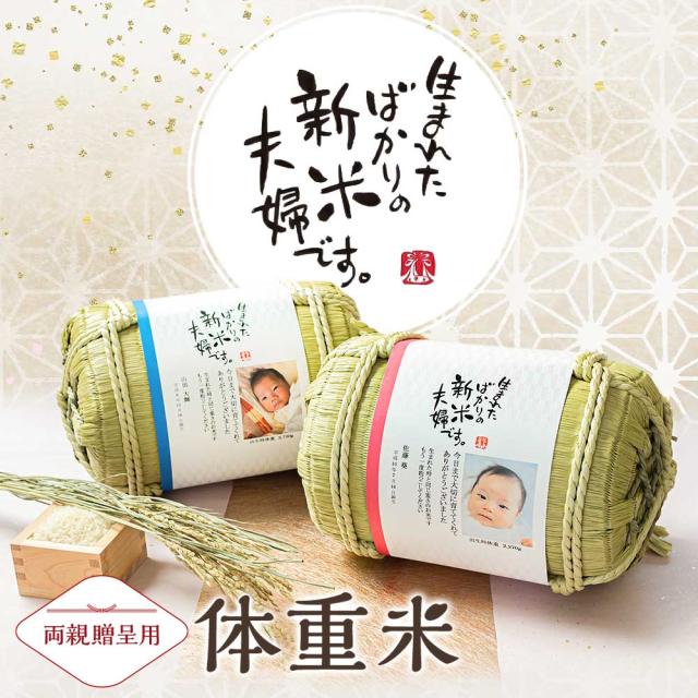 結婚披露宴で両親贈呈におすすめな俵形の体重米ギフト。新潟産コシヒカリを生まれた時の体重の分お米を入れて贈ります。