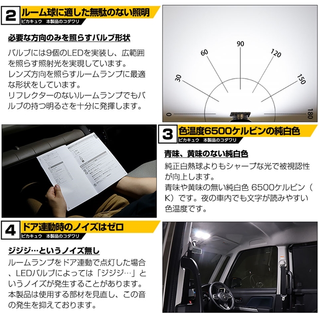 バルブには正面に合計9個のLEDが実装されており、ルームランプの必要な方向にのみ照射します。