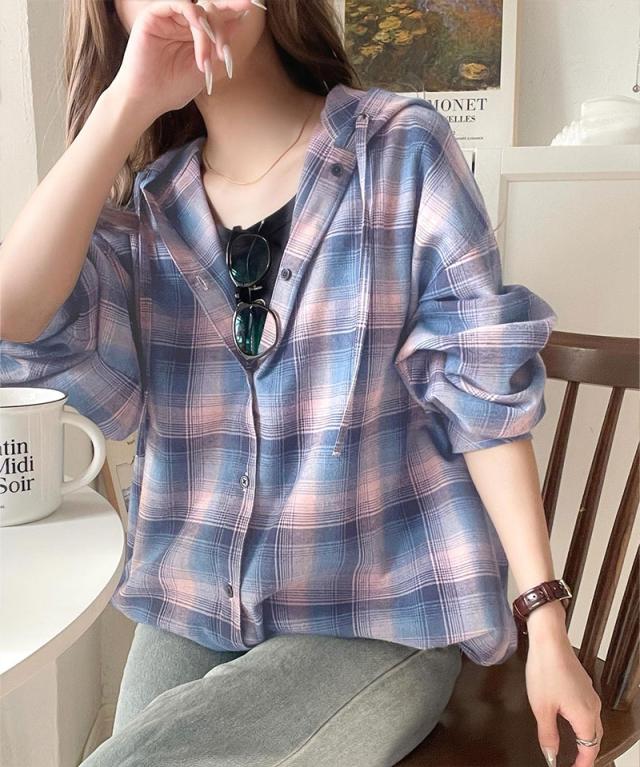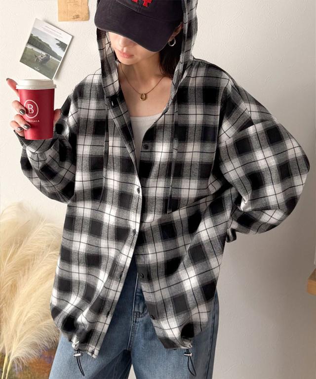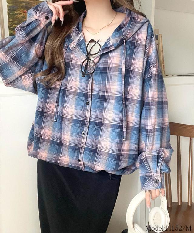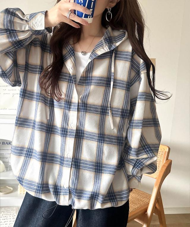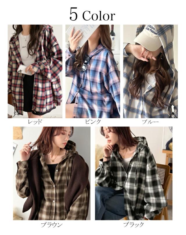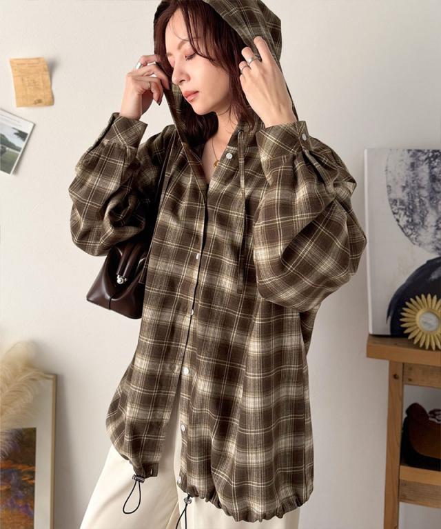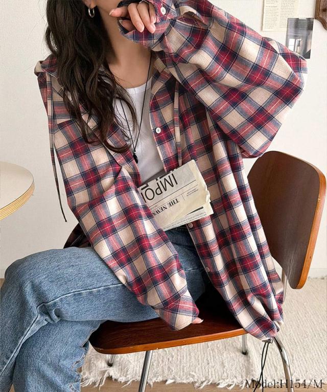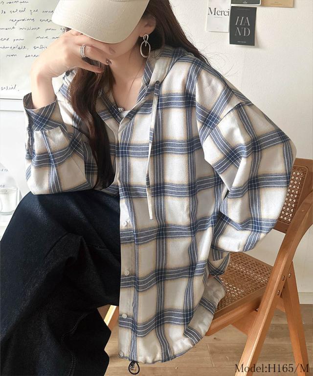 クラシカルエルフ春新作 トップス チェック シャツ 長袖 レディース 裾 ドロスト 微起毛 チェック柄 フーディ ゆるっと オーバーサイズ 羽織り 大きいサイズ 2026ss ce1010568
