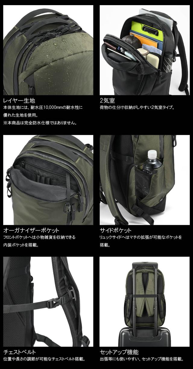 本体生地には耐水圧10,000mm以上の優れた防水素材を採用。 突然の雨や厳しい環境下でも、中の荷物をしっかり保護します。 通勤や出張はもちろん、アウトドアシーンでも安心して使用可能です。