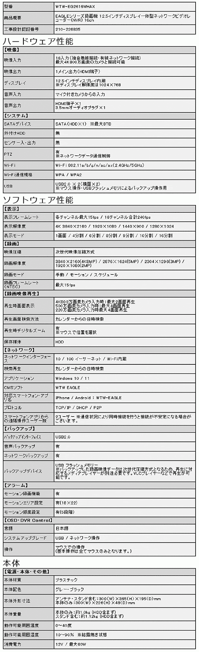 ■ WTW-EG2616WHAX-2TB EAGLEシリーズ対応 16ch HDD(2TB)内蔵 12.5インチディスプレイ一体型ネットワークビデオレコーダー