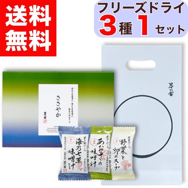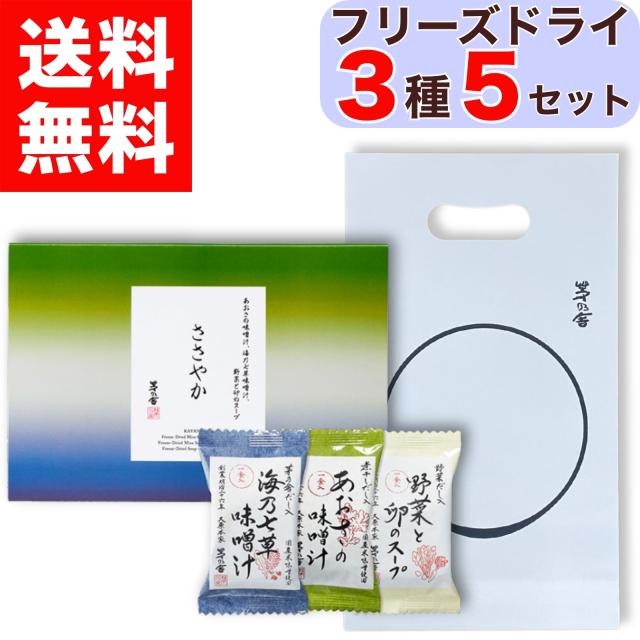 【 プチギフト / 贈答用 】 ささやか フリーズドライ 3種 5セット ( 海乃七草味噌汁 / あおさのみそ汁 / 野菜と卵のスープ ) ×各1食 簡易ギフト 手提げ袋付 箱入り 茅乃舎 久原本家 かやのや だし 出汁 茅乃だし 茅乃 かやの かやのだし