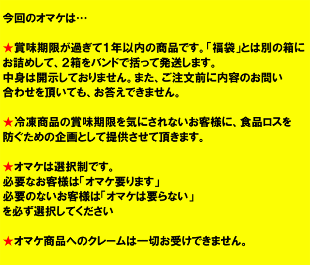 また、例外として業務用冷凍庫内でも1ヶ月より短い賞味期限の商品もございます。 その場合は該当する商品にのみ、個別に賞味期限シールを貼付してお詰めしております。