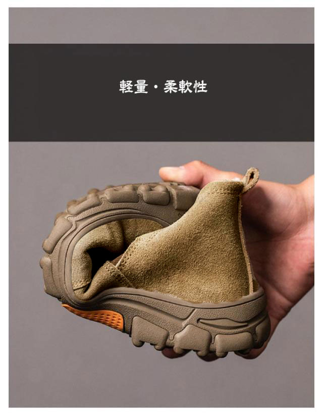 | 穿刺防止・つま先保護・軽量・柔軟性 【釘踏み抜き防止】ミッドソールはケブラー防弾繊維を特別に採用するなので、驚きの1100Nに達するまでの圧迫力に耐えられ、釘などに踏んでも平気。ソールは屈曲性も高く、足の動きを妨げません。 【鋼先芯入り】金槌の衝撃や刃物の落下など作業中の事故からつま先をしっかり保護しています。 【耐滑・耐摩耗性】作業靴として、耐摩耗性に優れたゴム素材と滑りにくさを考慮したアウトソールを採用します。底も滑り止めデザインで効果が向上させます。 【脱ぎ履き簡単】サイドゴアでさっと簡単に脱ぎ履きすることができます。 【様々なシーンに適応】おしゃれな安全靴で、作業服にも私服にも合わせやすい。登山、トレッキング、スポーツ、ハイキングシューズとしても使えます。 | |