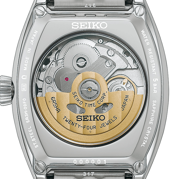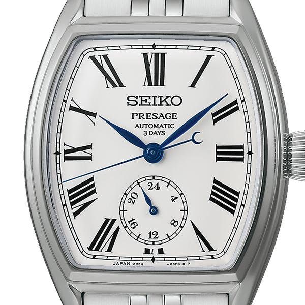 インデックスには、セイコー創成期の懐中時計「タイムキーパー」をオマージュしたローマ数字を配置。従来モデルから書体をアップデートし、トノー形ケースにふさわしい力強さとクラシカルな雰囲気を両立しています。ブルースチールの針が、白い琺瑯ダイヤルに美しく映え、上品なアクセントに。