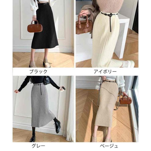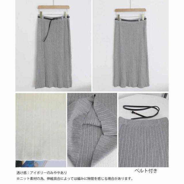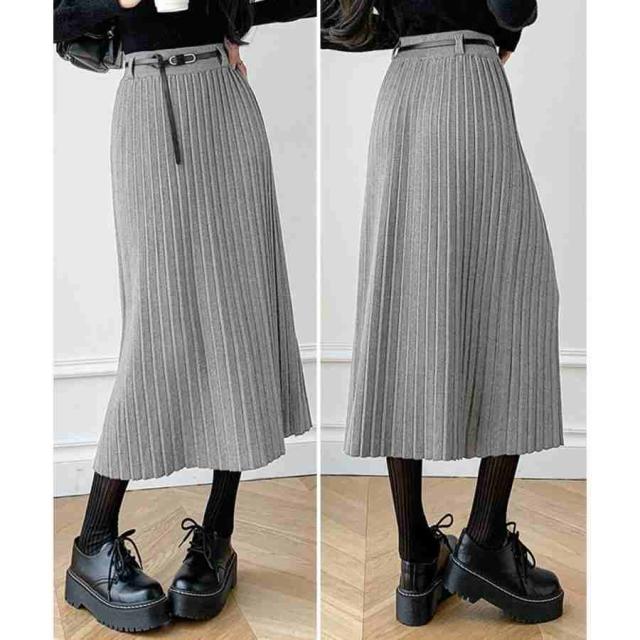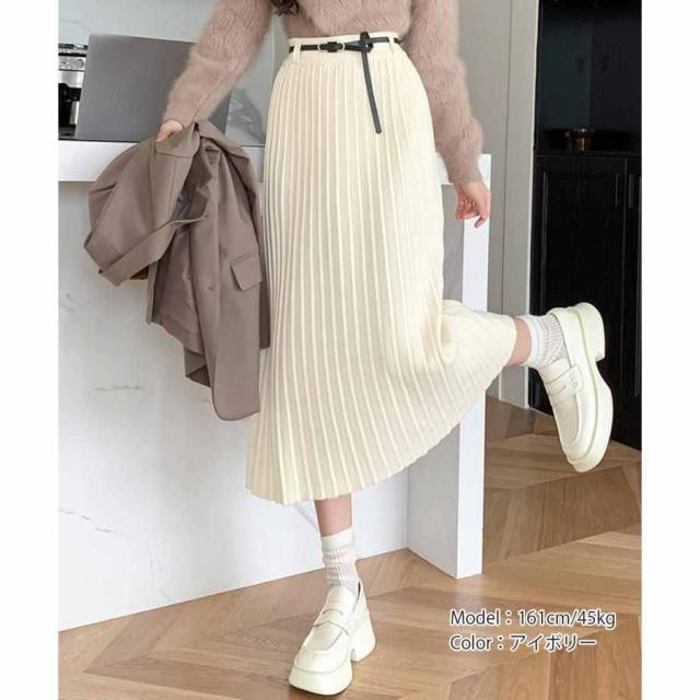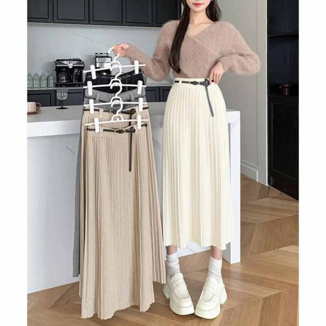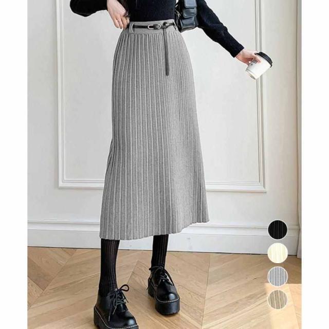 ワイドリブ プリーツスカート ベルト付きミモレ丈スカート 体型カバーオフィスカジュアル ロングスカート 美脚脚長 着やせ