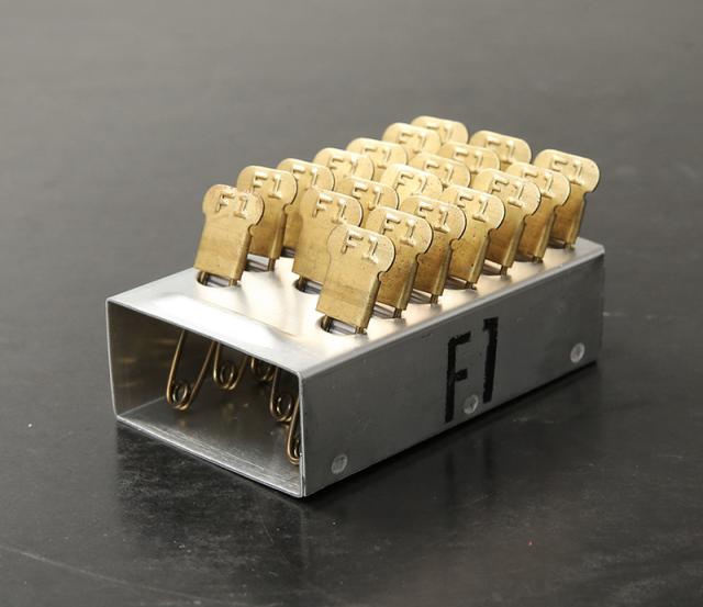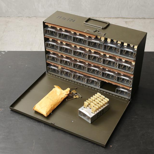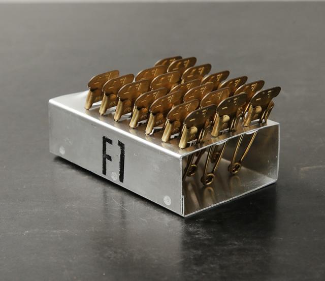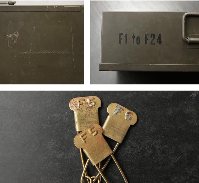 米軍内で洗濯物を識別する為に使われていたセーフティピンの希少なケース付きフルセットが入荷しました。こちらはKEYES DAVIS社製造の個体で年代は1980年代〜90年代ごろのものになります。ピンは真鍮製で、その丈夫さから多くの兵士がキーホルダー代わりにしていたといわれるほど雰囲気の良い逸品。分隊(10人くらいの陸軍での最小編成)ごとにナンバリングを変えて識別していたそうで、それぞれのピンには数字とアルファベットのエンボス加工が入っています。アルミ製の格納ケースに20本のピンを1ブロックとして、24個のブロックが収められており、予備用の無刻印のピン50本も完備。