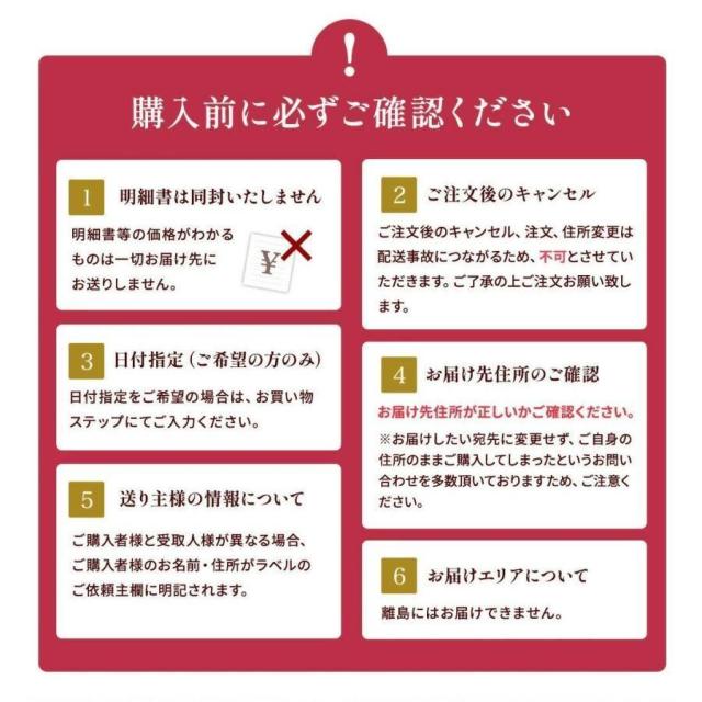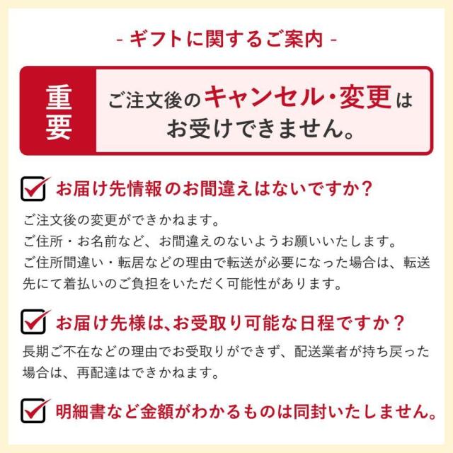 ・商品注文完了後、お届け先住所や宛名など、変更は原則として承っておりません。