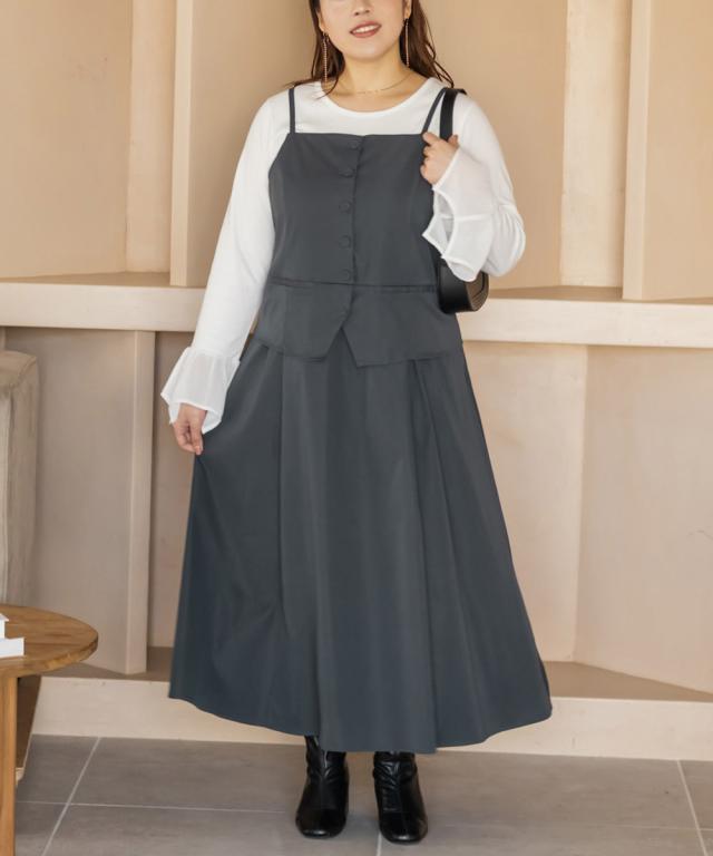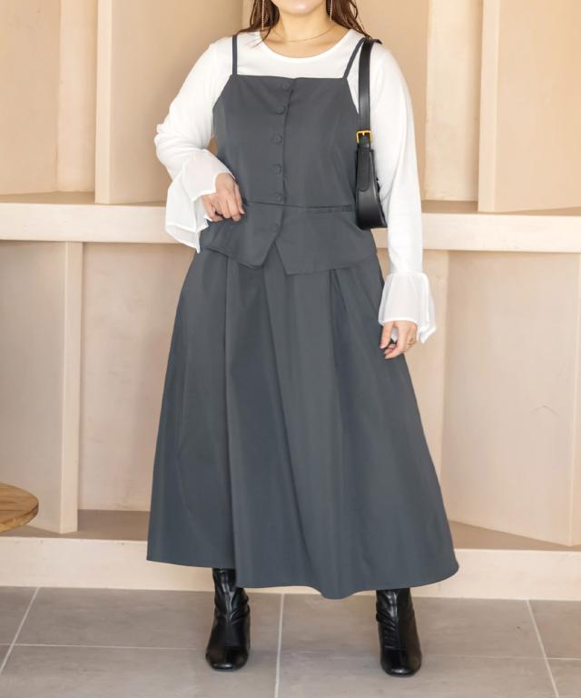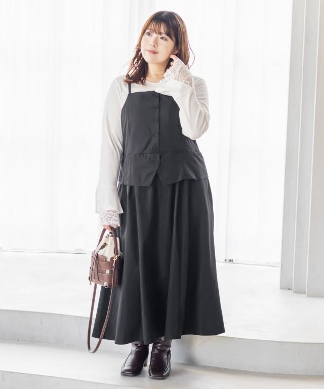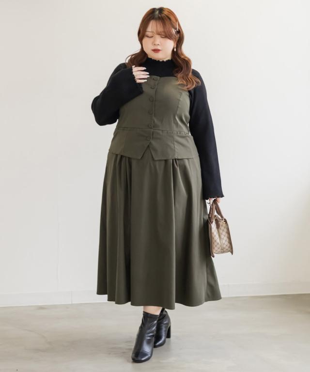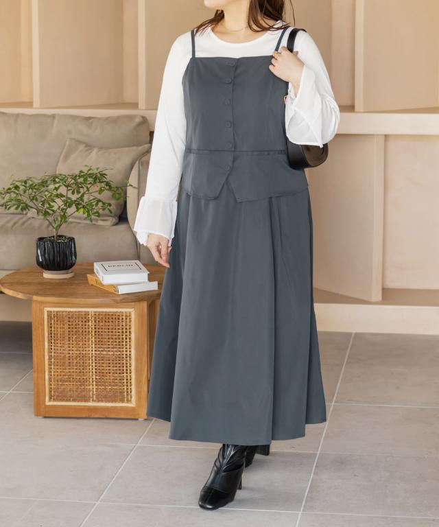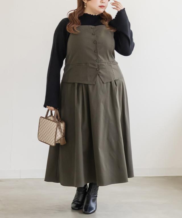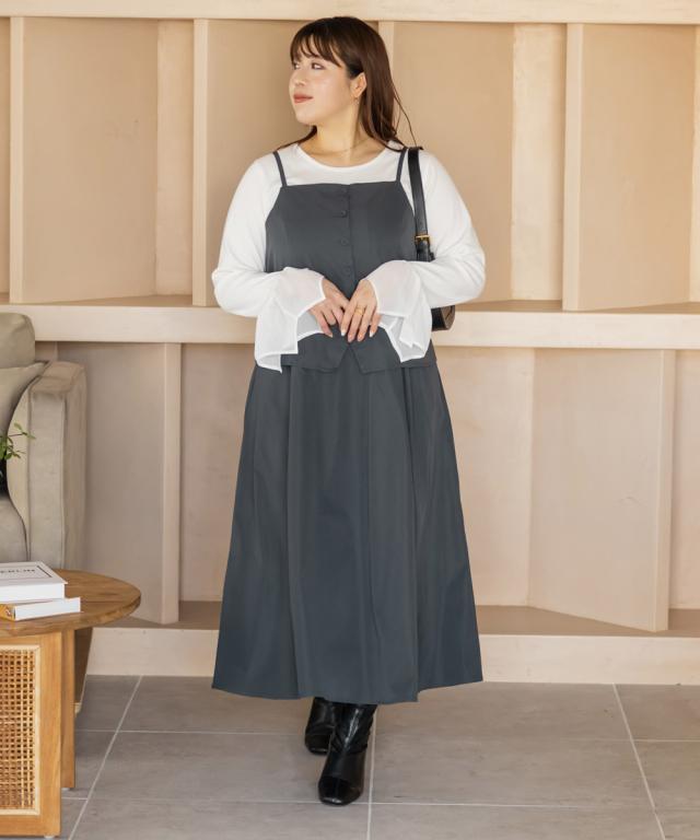 | 3Lサイズを着用しました。全体的にちょうどいいサイズ感で、ゴム入りで締め付け感なく楽に着られました。上半身はネックラインがすっきりしていて、フロントボタンのおかげで自然と華奢見えするのが嬉しいです。スカート部分はギャザー入りなので、下腹やヒップまわりをしっかりカバーしてくれて安心感があります。しっかりした生地感なのに重たくならず、1枚でトレンド感のあるスタイルが完成するのも◎ インナー次第で季節を問わず着回せるので、たくさん着たいアイテムです。 |
