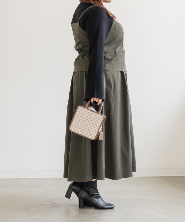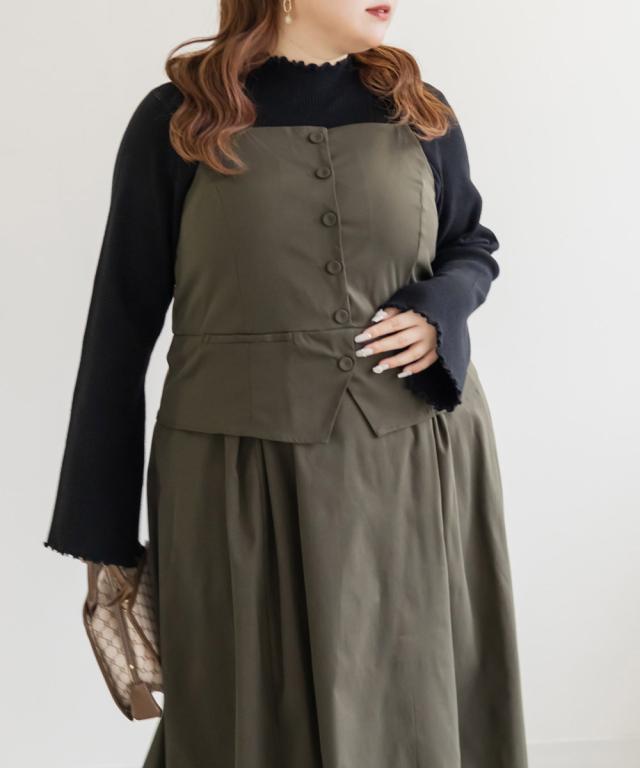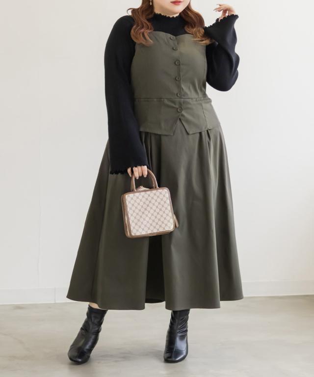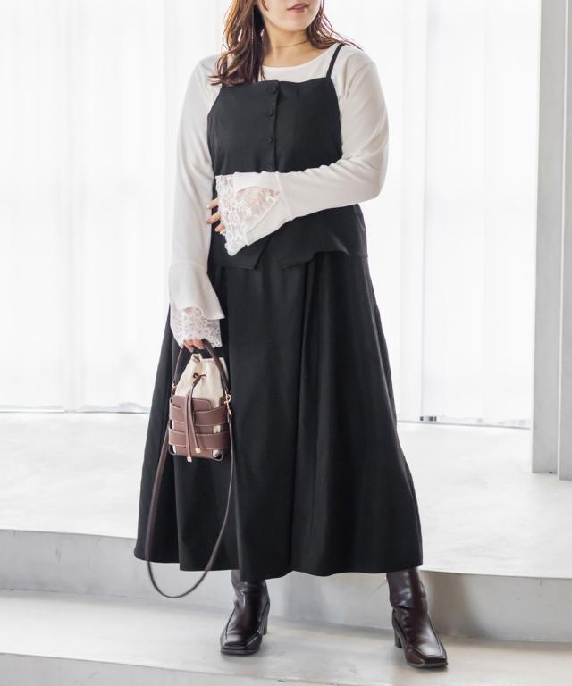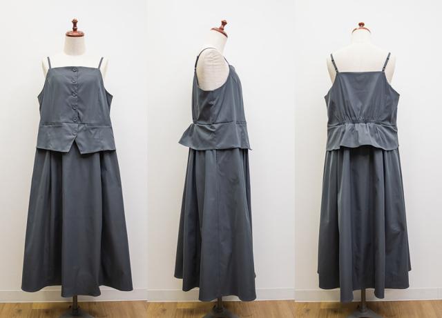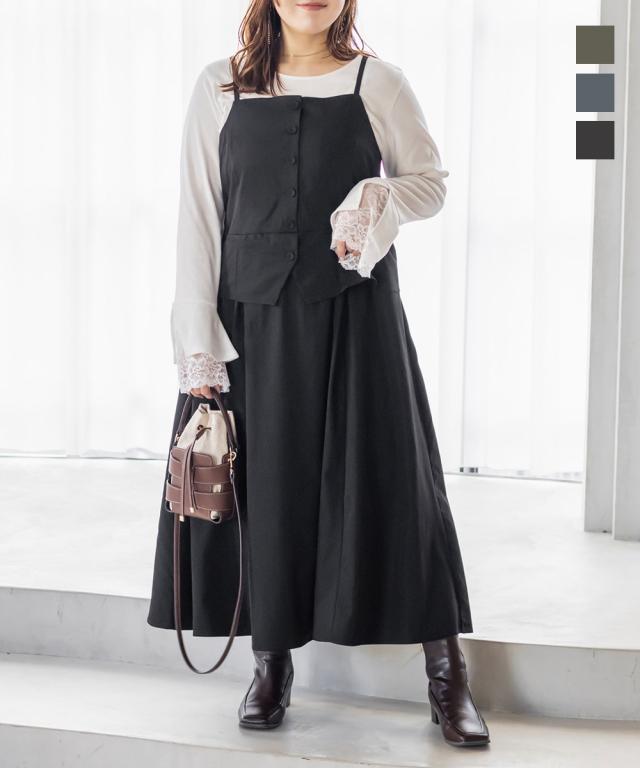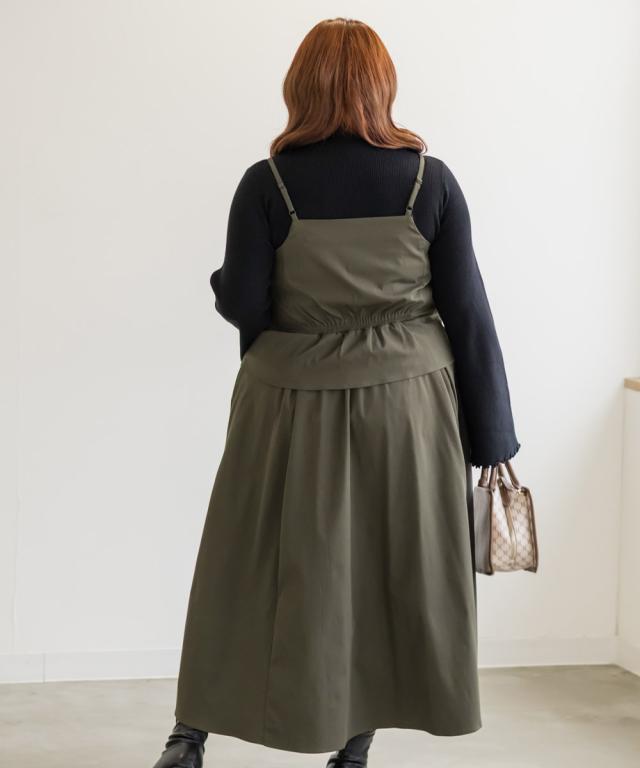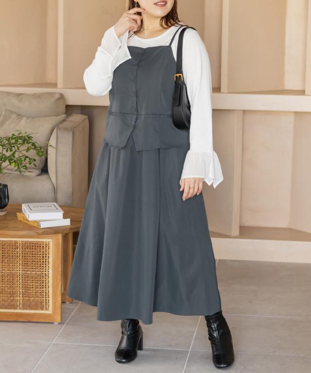 | 3Lサイズを着用しました。全体的にちょうどいいサイズ感で、ゴム入りで締め付け感なく楽に着られました。上半身はネックラインがすっきりしていて、フロントボタンのおかげで自然と華奢見えするのが嬉しいです。スカート部分はギャザー入りなので、下腹やヒップまわりをしっかりカバーしてくれて安心感があります。しっかりした生地感なのに重たくならず、1枚でトレンド感のあるスタイルが完成するのも◎ インナー次第で季節を問わず着回せるので、たくさん着たいアイテムです。 |