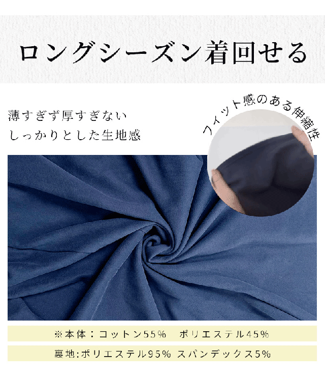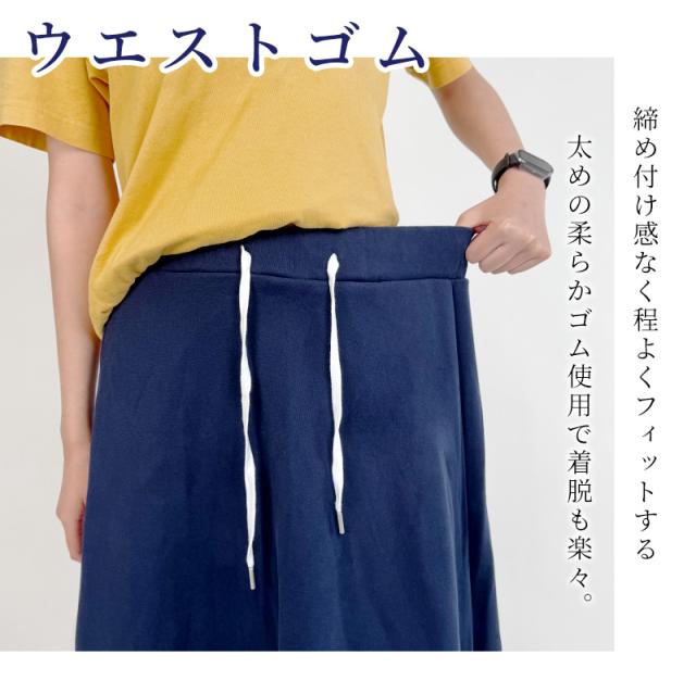 表地は綿混で肌触りが良く、裏地は伸縮性のあるポリエステル素材を使用。歩いたり階段を上がる時もストレスを感じにくく、スウェットスカートならではのリラックス感ある着心地を実現しました。程よい厚みで透けにくく、季節を問わずロングシーズン活躍します。