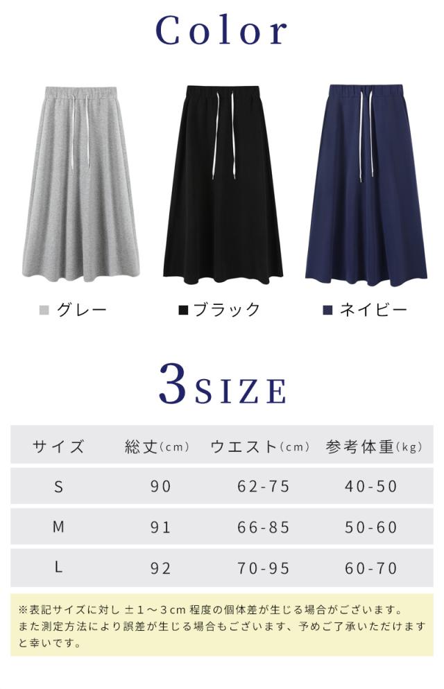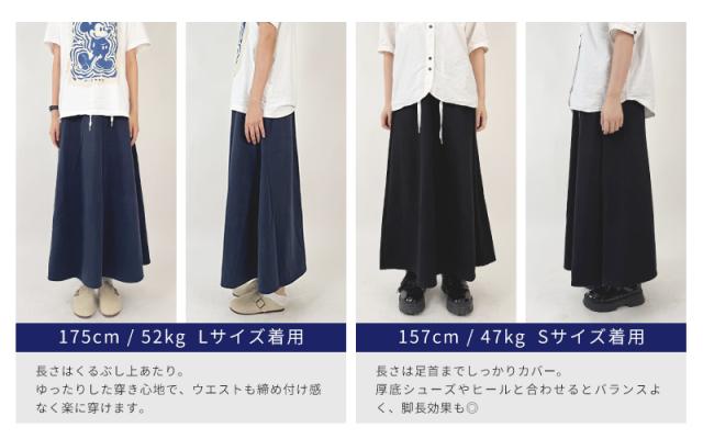 ウエストゴム付きのスウェットスカートは、締めつけ感が少なく一日中ラクちん。ロングスカートならではのゆったりシルエットで体型カバー効果も◎