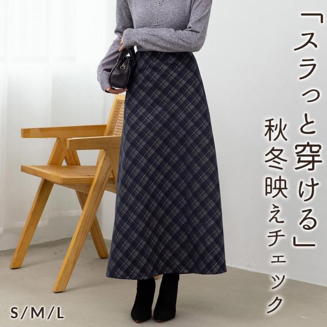 「優雅に染まるチェック」ロング マキシ ストレート スカート レディース ボトムス ナロースカート Aライン 内側ゴム入り ハイウエスト きれいめ 暖かさ ハンガーループ 表 微起毛 ダブルフェイス生地 裏面 さらさら生地 中厚手 チェック 秋冬