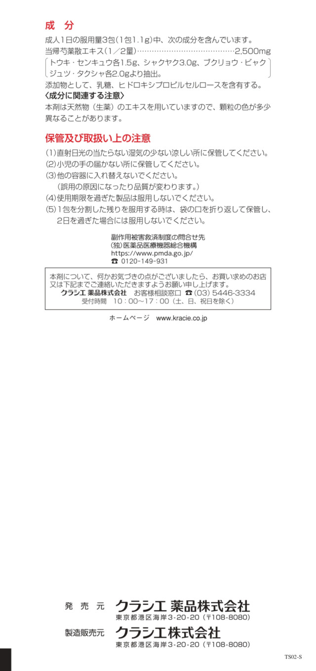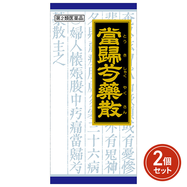 商品名 第2類医薬品 漢方当帰芍薬散料エキス顆粒 45包×2個セット クラシエ 容量 45包×2個セット メーカー クラシエ カテゴリー 医療・介護・医薬品>医薬品>漢方薬>漢方薬【第一・二類医薬品(指定第二医薬品含む)】 効果・効能 体力虚弱で、冷え症で貧血の傾向があり疲労しやすく、ときに下腹部痛、頭重、めまい、肩こり、耳鳴り、動悸などを訴えるものの次の諸症:月経不順、月経異常、月経痛、更年期障害、産前産後あるいは流産による障害(貧血、疲労倦怠、めまい、むくみ)、めまい・立ちくらみ、頭重、肩こり、腰痛、足腰の冷え症、しもやけ、むくみ、しみ、耳鳴り 用法・用量 1日3回食前または食間に水または白湯にて服用。
