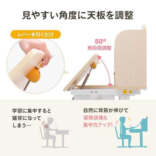 ●天板は最大50°まで角度を付けられるチルト機能付きです。