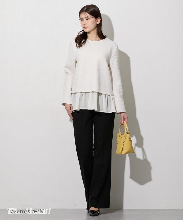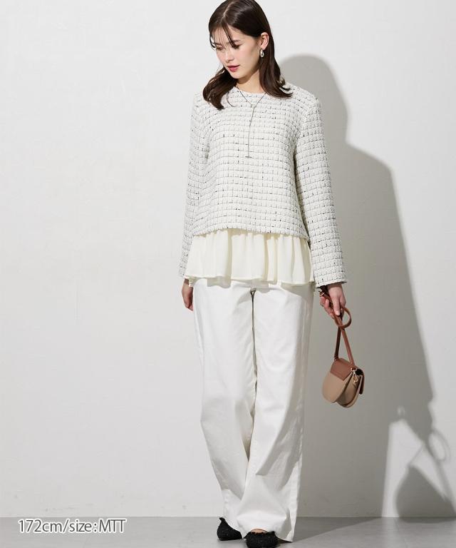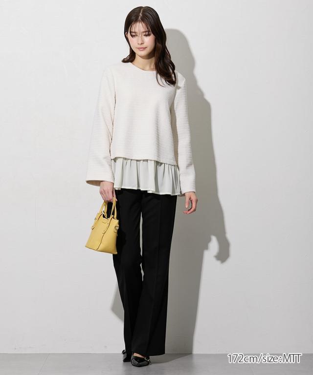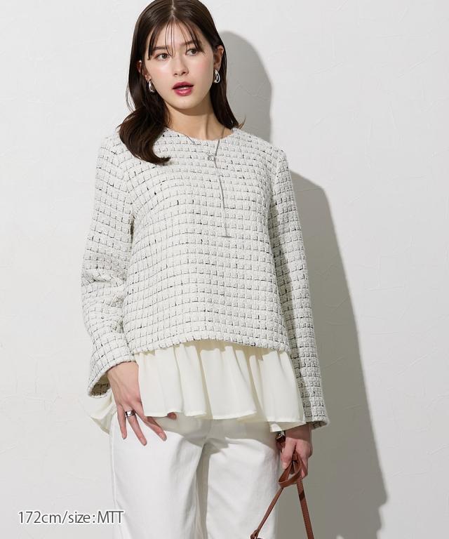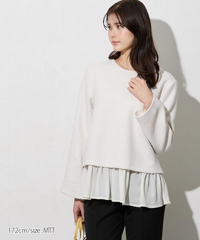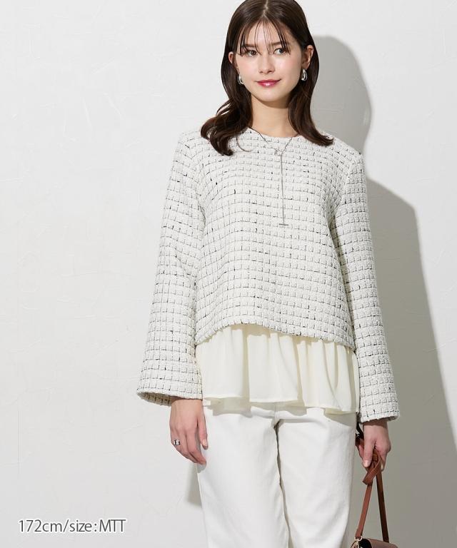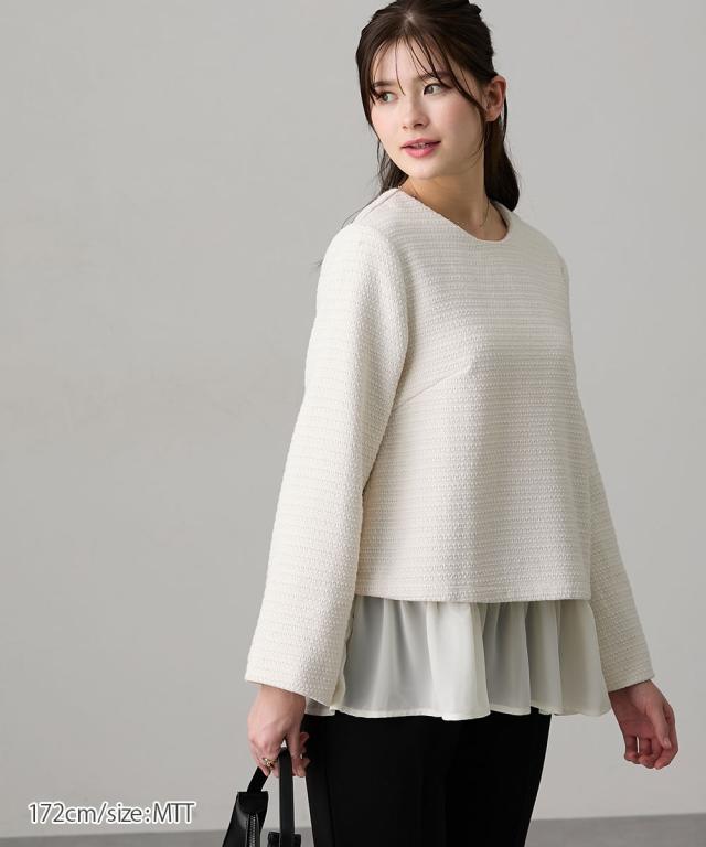 洗練されたレイヤード一枚で完成するツイード×シフォンのドッキングプルオーバー ■デザイン 温かみのあるツイード素材の裾から、シフォンが覗くレイヤードデザイン。テクニック不要で、着るだけでおしゃれが完成します。首元はすっきりとしたクルーネック。アクセサリーが映えるデザインで、オフィスからプライベートまで幅広く対応します。後ろ姿も抜かりなく。裾のシフォンがヒップラインを優しくカバーし、360度どこから見ても綺麗なシルエットを保ちます。裏地付き(総裏)でスエード素材で心配なチクチク感を気にすることなく着用可能です。 ■素材 春にぴったりな明るめカラーのツイード生地を採用。適度な厚みがあり、体のラインを拾いすぎないのが魅力です。裾部分には透け感のあるシフォンを使用。ツイードの落ち着いた質感と、風に揺れるシフォンの対比が、大人の女性の柔らかさと品格を引き立てる一着です。 ■おすすめのスタイリング 細身のセンタープレスパンツやテーパードパンツと合わせるのが王道です。足元はパンプスを選べば、清潔感のある通勤スタイルに。あえてワイドパンツを合わせ、ゆったりとしたシルエットを楽しむのも今どきです。シンプルな首元なので、ロングネックレ