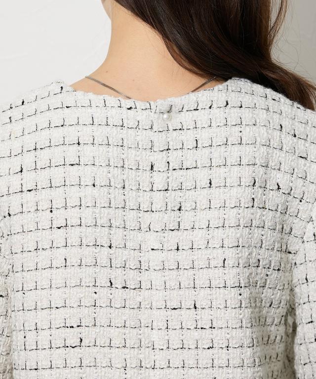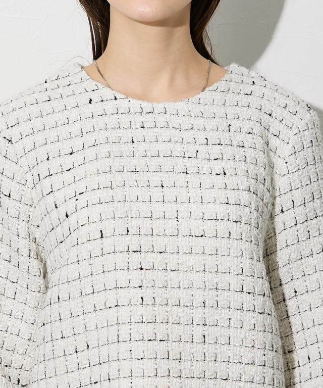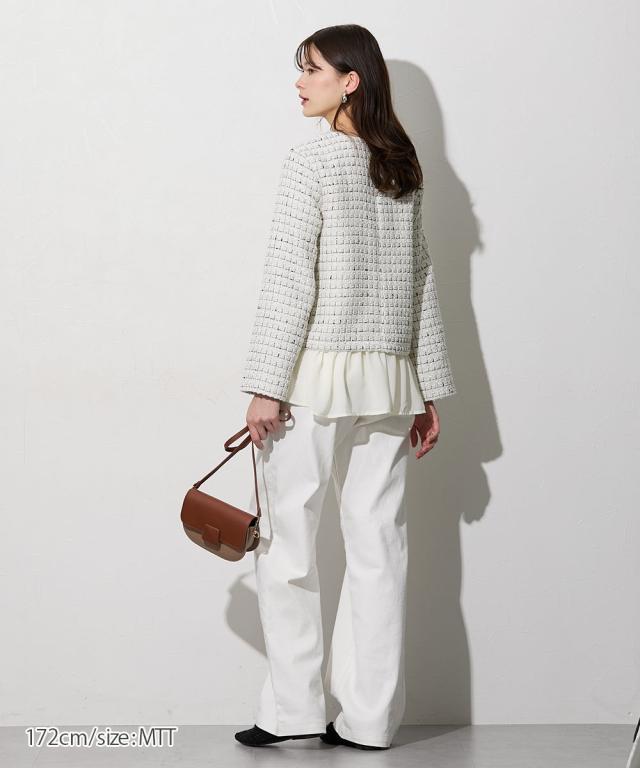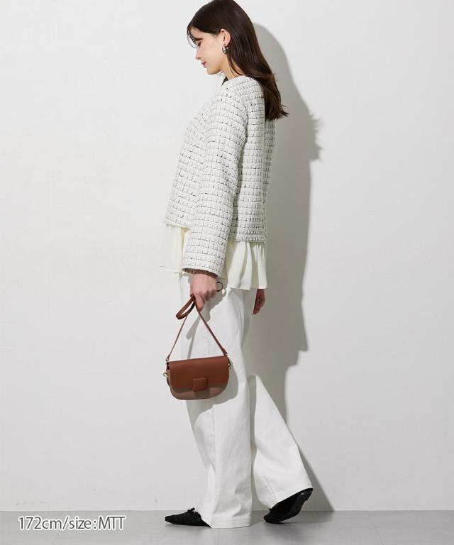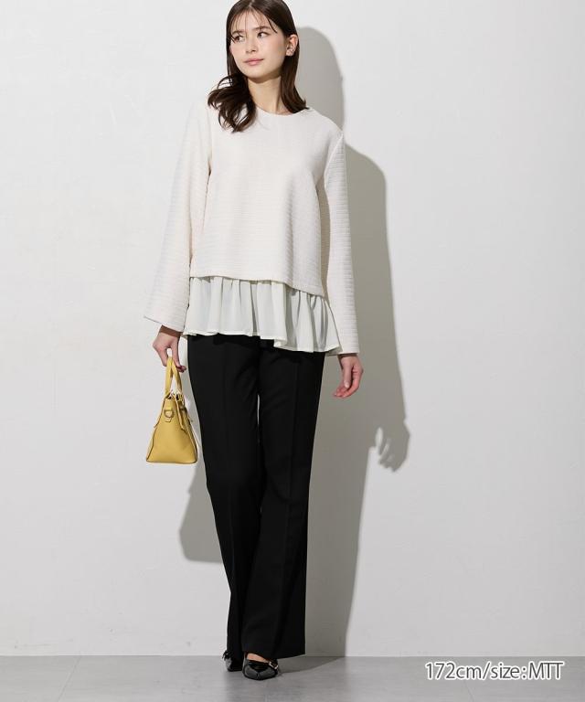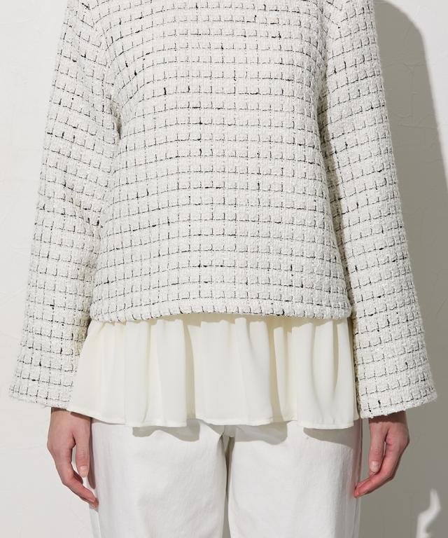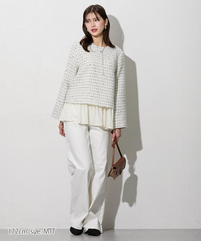 洗練されたレイヤード一枚で完成するツイード×シフォンのドッキングプルオーバー ■デザイン 温かみのあるツイード素材の裾から、シフォンが覗くレイヤードデザイン。テクニック不要で、着るだけでおしゃれが完成します。首元はすっきりとしたクルーネック。アクセサリーが映えるデザインで、オフィスからプライベートまで幅広く対応します。後ろ姿も抜かりなく。裾のシフォンがヒップラインを優しくカバーし、360度どこから見ても綺麗なシルエットを保ちます。裏地付き(総裏)でスエード素材で心配なチクチク感を気にすることなく着用可能です。 ■素材 春にぴったりな明るめカラーのツイード生地を採用。適度な厚みがあり、体のラインを拾いすぎないのが魅力です。裾部分には透け感のあるシフォンを使用。ツイードの落ち着いた質感と、風に揺れるシフォンの対比が、大人の女性の柔らかさと品格を引き立てる一着です。 ■おすすめのスタイリング 細身のセンタープレスパンツやテーパードパンツと合わせるのが王道です。足元はパンプスを選べば、清潔感のある通勤スタイルに。あえてワイドパンツを合わせ、ゆったりとしたシルエットを楽しむのも今どきです。シンプルな首元なので、ロングネックレ