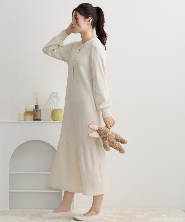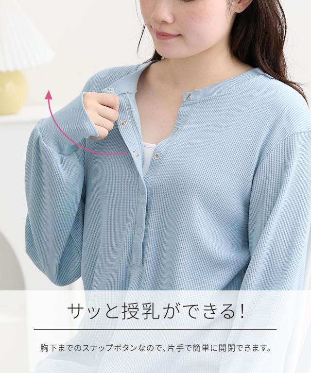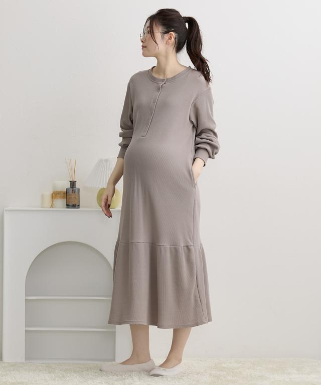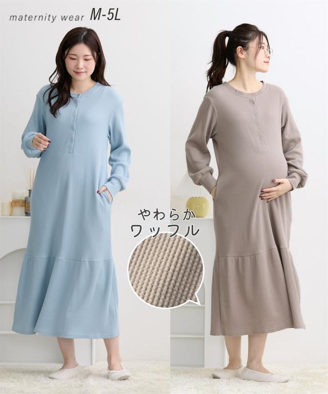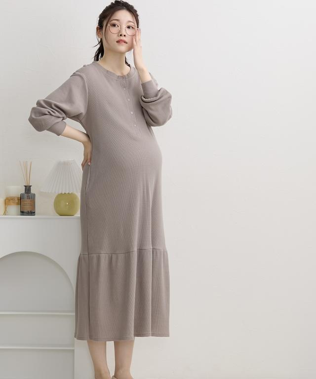 【マタニティウエア・授乳服】ワッフル 裾ティアード長袖ネグリジェ(産前・産後)