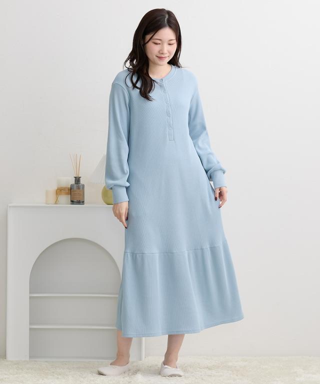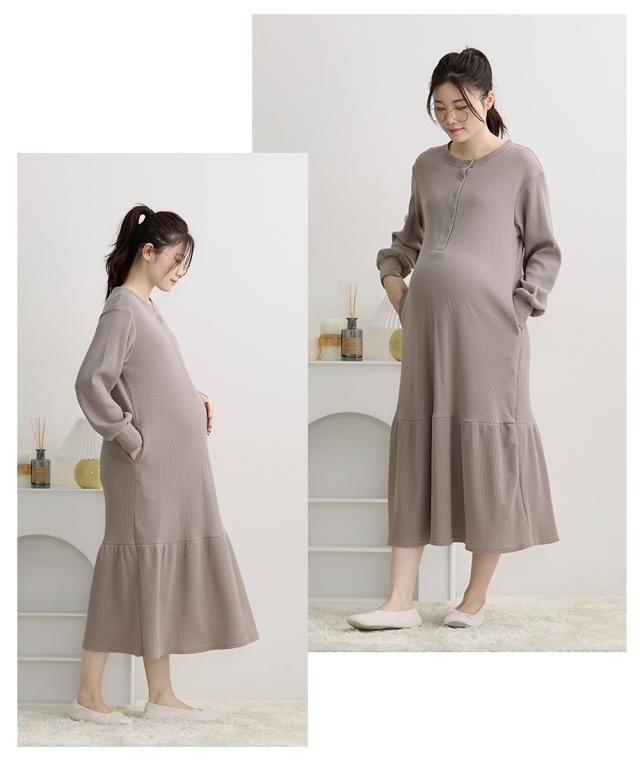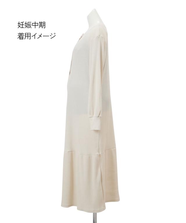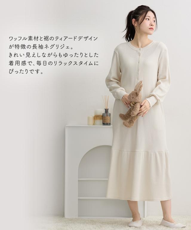 裾のティアードデザインがかわいい、ワッフル素材のマタニティネグリジェです。 ■design ・締め付け感のないゆったりとしたシルエット ・裾の切り替えから広がるティアードデザインが大人かわいく、お部屋でのリラックスタイムをフェミニンに演出します。 ■point ・胸元は深めに開くスナップボタン仕様になっているため、スムーズに授乳ができます。 ・家事や手洗いの際に腕まくりしやすい袖口リブや、スマホも入る両脇ポケットなど、ママの日常に寄り添った実用的な機能が充実しています。 ■fabric ・凹凸感のある綿混のワッフル素材で、やわらかくさらっとした着心地。