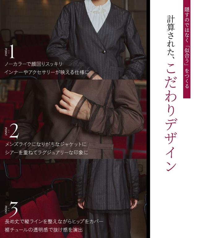 【Callarus(カラルス)】 〜アナタにしかない「美しさ」を何にも縛られずに「自由に」〜 まっすぐブレない美しさで人々を魅了する花“calla lily”と ラテン語で輝くという意味の“clarus”を合わせた造語がブランド名の由来です。 シーンにもテイストにも年齢にも縛られない 自由な着こなしを実現する上品な1枚で、日常に少しの特別感を。 ◆商品説明 DRESSは女性を最上級に美しく見せる服 結婚式だけなく、様々なシーンで自分らしさを表現していただきたい想いで企画・提案 Callarusオリジナル企画商品で、自分にしかない美しさ・個性を表現 スタイリッシュなジャケットにチュールを重ねたこだわりデザインジャケット チュールを重ねることにより、一気にこなた着こなしに 袖部分のチュールギャザーが大人の可愛さを表現 ジャケットはスタイリッシュなストライプ柄と無地柄を揃えました ボタンはスクエアデザインで、モードな雰囲気に 同素材のパンツ(品番:BLW0225E0026)と合わせて、セットアップコーデに お手元のブラウスやインナーと合わせることで、自分だけのコーデが完成 気分やシーンに合わせて、自由にドレスコーデの幅を広げることができます 自分にしかない美しさを演出してくれる
