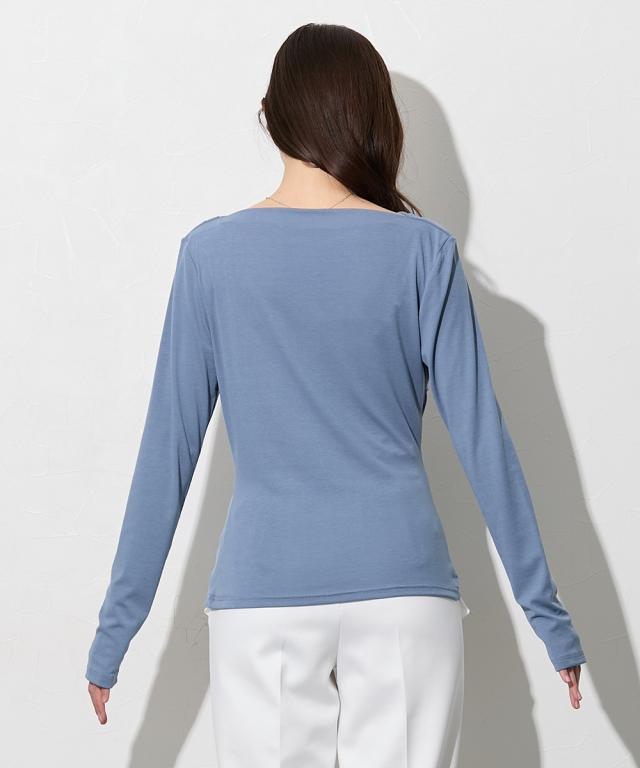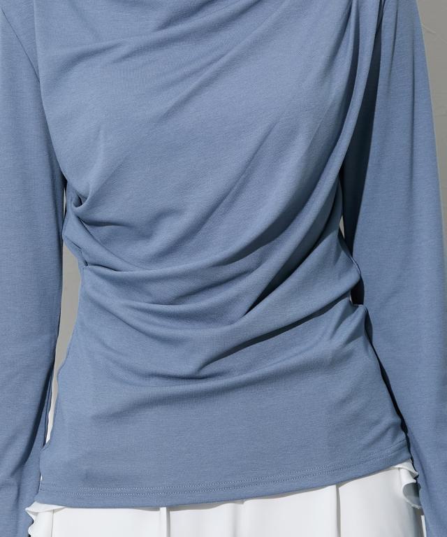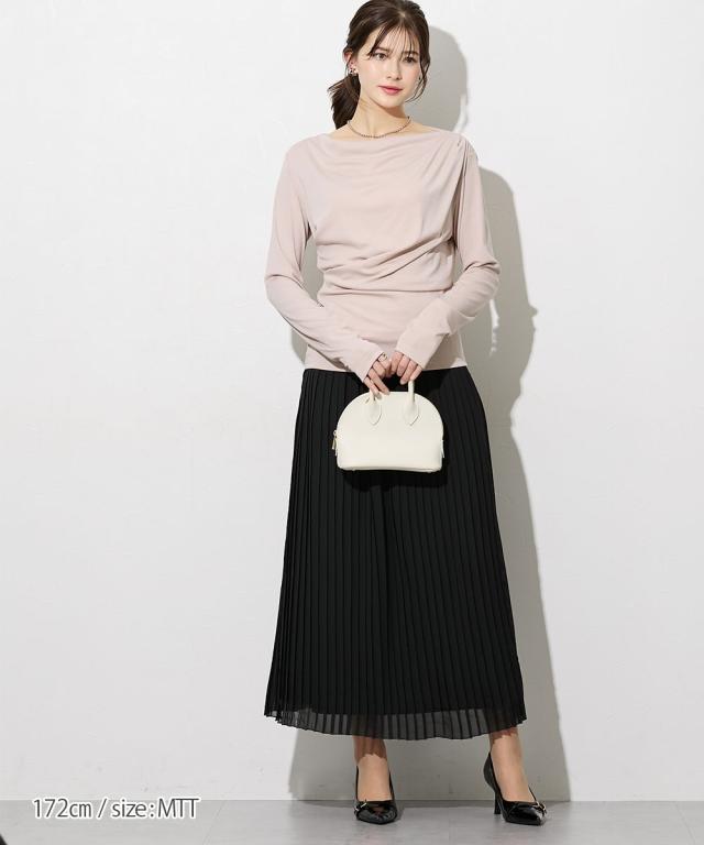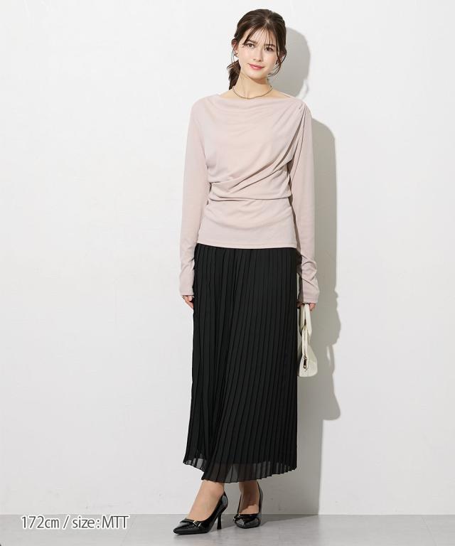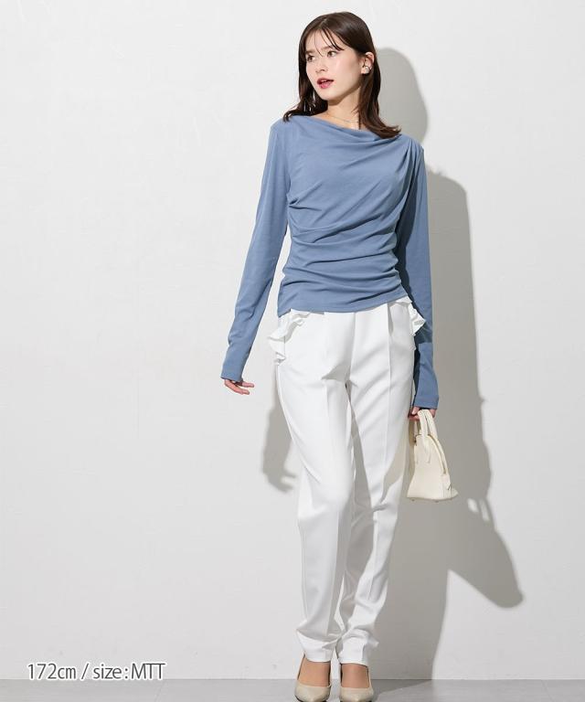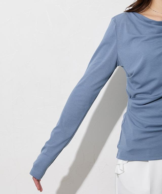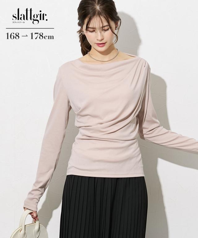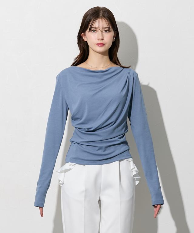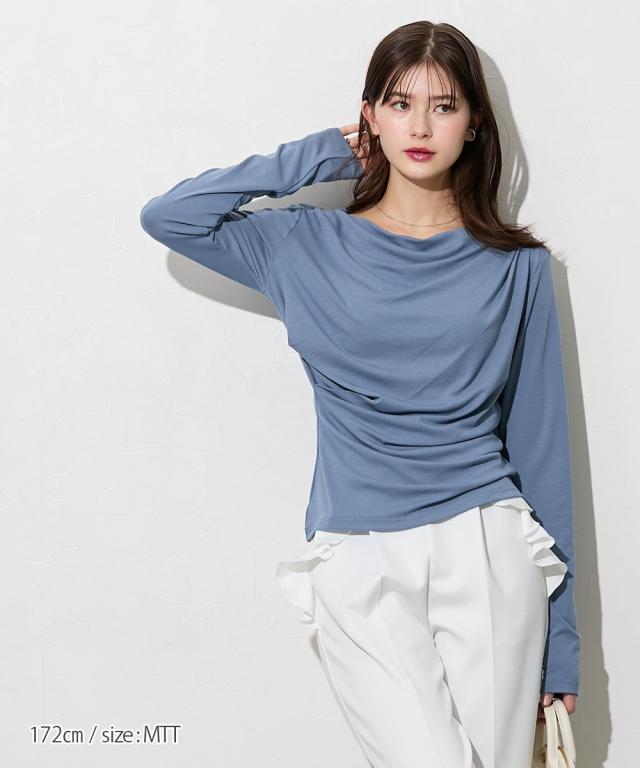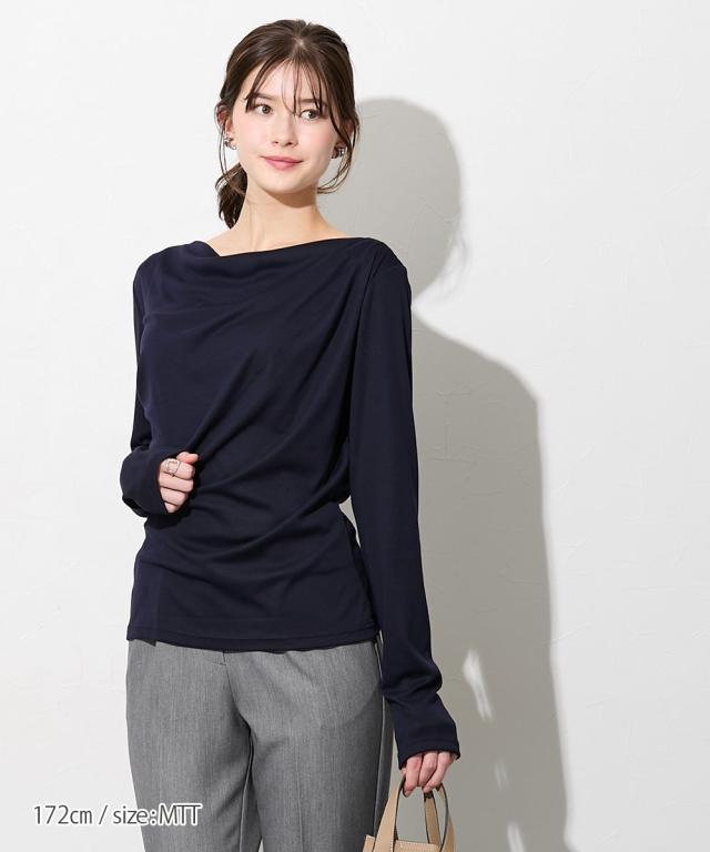 【高身長の方向け】着るだけで、造形美。高身長さんのシルエットを最大限に引き立てる、大人のドレープトップス。 ■デザイン フロントからサイドにかけて施されたアシンメトリーなドレープが、高い腰位置をさらに強調。 気になるお腹周りを自然にカバーしつつ、女性らしいメリハリのあるXラインを作ります。カットソー素材なので、ドレープが硬くなりすぎず、体に優しくフィットするのも魅力です。潔く横に開いたボートネックが、肩幅を活かしたヘルシーな色気を演出します。 一枚でさらりと着ても、ネックレスなどのアクセサリーを添えても映える、品格漂うネックラインです。 ■素材 柔らかでとろみのあるカットソー素材を採用しました。直接肌に触れた瞬間に感じる心地よさを是非体験してみてください。徹底的に「軽やかさ」と「質感」にこだわりました。 ■おすすめのスタイリング ビジネス&オケージョン: タイトなスカートやセンタープレスパンツにインすれば、ドレープが際立つエレガントなオフィススタイルに。高い位置にポイントがあるため、脚長効果がさらに加速します。カジュアル: ホワイトのパンツやデニムと合わせて。トップスの鮮やかなカラーとドレープの陰影が、シンプルなワ