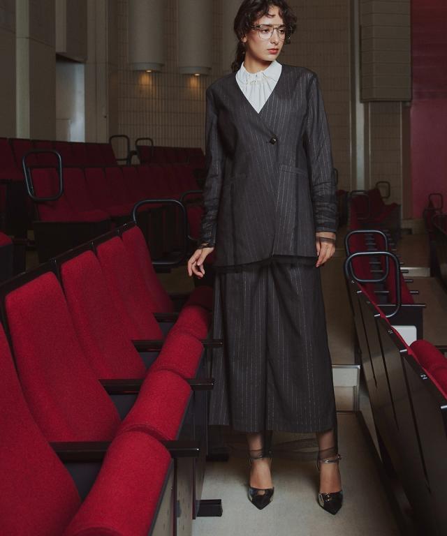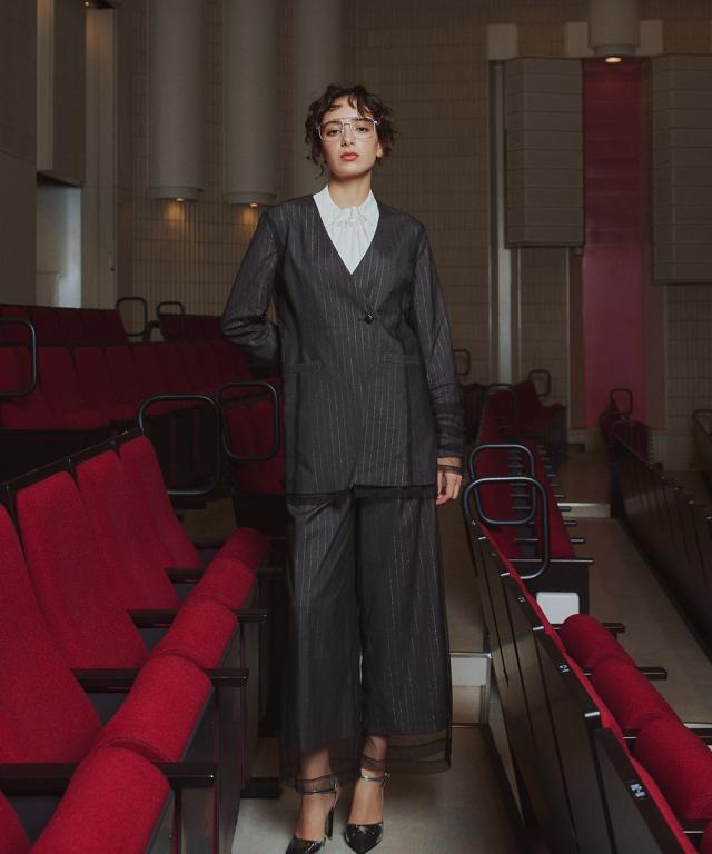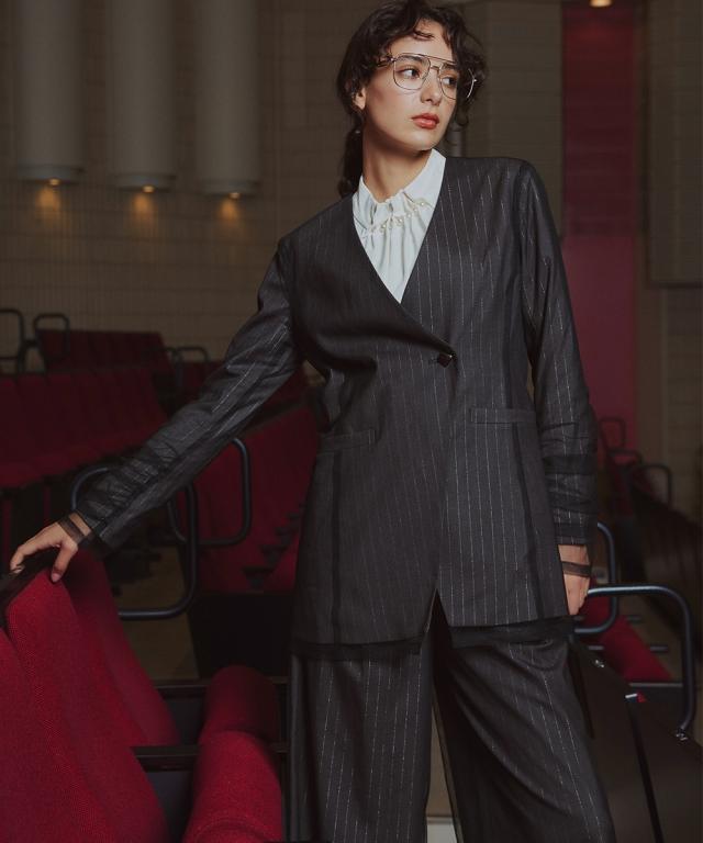 品質=ストライプ外側:ポリエステル100%(編物)内側:ポリエステル67%レーヨン30%ポリウレタン3%(織物)(スリット糸使用) 裏地無 パンツ:前ファスナー内ボタン開 ウエスト後ゴム入 ポケット両脇 ※繊細な生地を使用しているため、引っかかりなどにご注意ください。 原産国:中国製 備考:洗濯機OK(ネット使用)