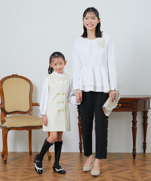 卒園式や入学式、冠婚葬祭におすすめ! これだけで完璧なハレの日スタイルが完成するワンピースとブラウスのセット☆ コサージュもセットになっていてピンで着脱可能 ■デザイン ・トレンドの「ジレ風」デザイン。 従来のワンピースとは一味違う、洗練された都会的な印象に。 ・きちんと感を演出するダブルボタン。 テーラードカラー(襟付き)のデザインが、お子様の表情をキリッと引き立てます。 ・甘すぎない「大人顔」シルエット。 広がりすぎないタイトめのラインが、スマートで上品な雰囲気を醸し出します。 ・ふんわりパフスリーブ。 袖口のシャーリングが、女の子らしい柔らかなニュアンスをプラスします。 ・セパレートでも使える! ワンピースは手持ちのタートルネックと合わせたり、ブラウスはジャンスカのインナーにしたりと、デイリーにも着回せます。 ・冠婚葬祭から発表会まで。 ピアノの発表会、七五三、結婚式のお呼ばれなど、幅広いシーンに対応。 ■素材 ・しっかりとした上質な素材
