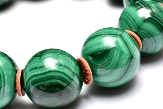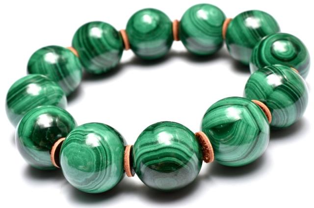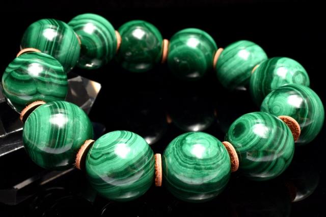 | 特徴・意味 | 大珠で大迫力!渦を巻いたような天眼模様が美しく、 温かみあるグリーンカラーから癒やしをもらえそうです。 珠の間に皮の緩衝材をいれています。 孔雀石(マラカイト)は銅を含むもっとも一般的な二次鉱物です。 一次鉱床の銅鉱石が大気中の二酸化炭素や地下水の作用によって風化し、銅化合物が濃集して形成された二次鉱床として一次鉱床の周辺などに分布します。 現在ではロシアのウラル山地、次いで南アフリカが主な産地となっています。ウラルでは建築建材に利用できるほど大きな孔雀石を産出するそうです。 |