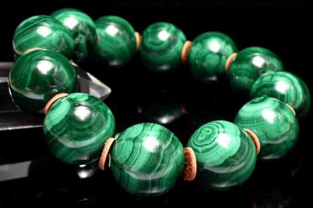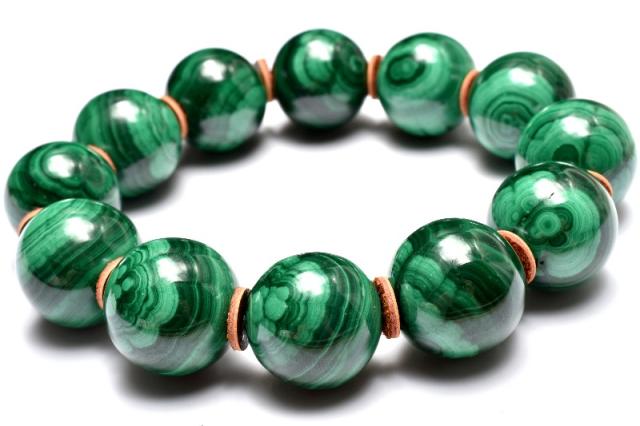 | 特徴・意味 | 大珠で大迫力!渦を巻いたような天眼模様が美しく、 温かみあるグリーンカラーから癒やしをもらえそうです。 珠の間に皮の緩衝材をいれています。 孔雀石(マラカイト)は銅を含むもっとも一般的な二次鉱物です。 一次鉱床の銅鉱石が大気中の二酸化炭素や地下水の作用によって風化し、銅化合物が濃集して形成された二次鉱床として一次鉱床の周辺などに分布します。 現在ではロシアのウラル山地、次いで南アフリカが主な産地となっています。ウラルでは建築建材に利用できるほど大きな孔雀石を産出するそうです。 |