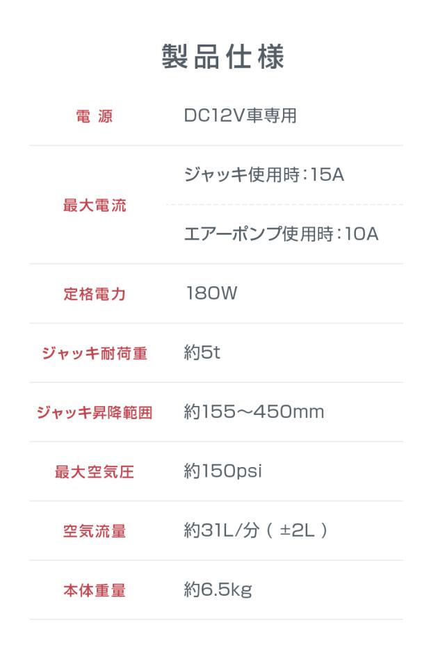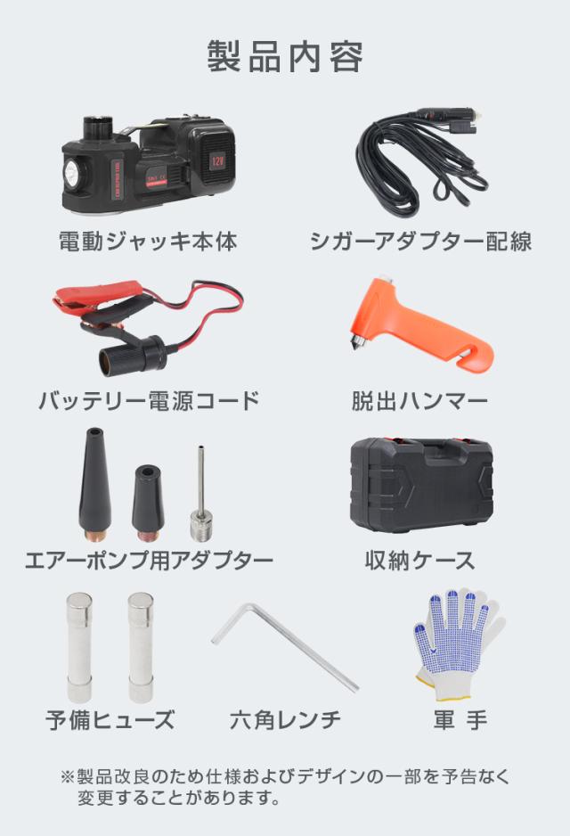 シガーアダプター配線 ×1 バッテリー電源コード ×1 脱出ハンマー ×1 エアーポンプ用アダプター 3種 収納ケース ×1 予備ヒューズ 六角レンチ 軍手 日本語説明書 |