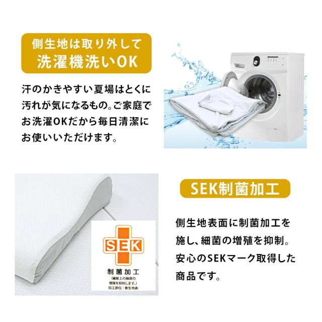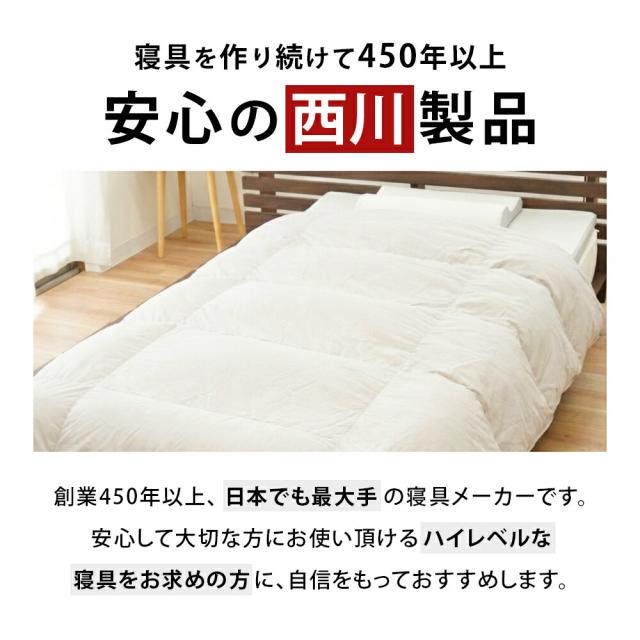 ・羽毛とわたのイイトコ取り! ハイブリッド掛け布団 保温力が高く軽やかな羽毛と、弾力がありホコリが出にくいポリエステルわたを組み合わせました。それぞれの素材の良さを活かした、こだわりの掛け布団です。 ・特殊立体キルト立体キルトをハイブリッド仕様にすることで、体にフィットし、高い保温力を実現しました。 ・詰め物量1.3kg羽毛量を抑えた布団が増える中、羽毛とわたを組み合わせた詰め物量1.3kgを実現。 ・綿混生地軽くて丈夫なポリエステル繊維に、天然素材の綿を配合して吸湿性をプラスしました。 ・高反発ウレタンフォーム使用 マットレスパッド高反発ウレタンフォームを使用したマットレスパッド。コンパクトに畳める人気の三つ折りタイプです。さらに製品重量は約2.5kgと軽量なので取り扱いも簡単。 ・腰部はへたりやすい一番体重がかかりやすい中央部分は、頭部や脚部と入れ替えて使うことで、寝心地が長持ちします。 ・開閉しやすいL字ファスナーファスナーは各部位毎に付いています。 ・厚み約4cmマットレスに重ねて使うことで、寝心地をアップし、体をしっかりサポートします。※体格の良い方は底つき感を感じる場合がございます。そのためベッドやマットレスの上に補助的に使用することをお勧めします。 ・スタンダードで使いやすい 低反発ウレタン枕むにゅふわな感触がたまらない低反発まくら。体型や頭の形状を問わず、また横向き寝でも仰向き寝でも頭のカタチにフィットします。 ・側生地は取り外して洗濯機洗いOK汗のかきやすい夏場はとくに汚れが気になるもの。ご家庭でお洗濯OKだから毎日清潔にお使いいただけます。 ・SEK制菌加工側生地表面に制菌加工を施し、細菌の増殖を抑制。安心のSEKマーク取得した商品です。 ・寝具を作り続けて450年以上 安心の西川製品創業450年以上、日本でも最大手の寝具メーカーです。安心して大切な方にお使い頂けるハイレベルな寝具をお求めの方に、自信をもっておすすめします。 |