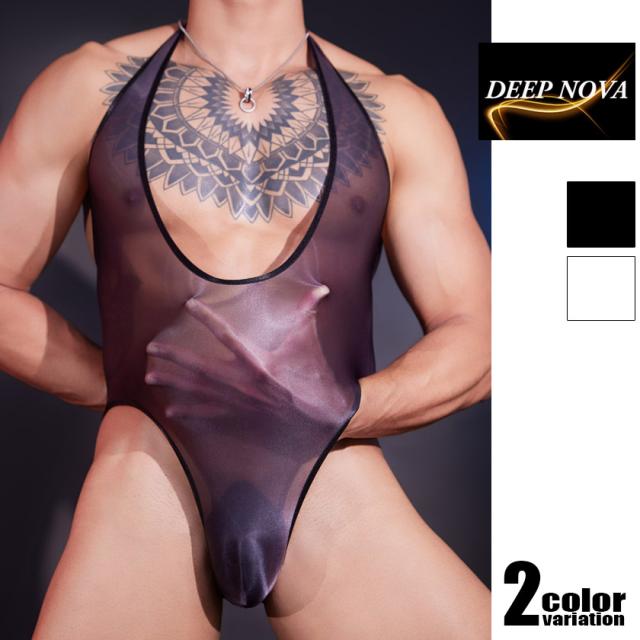 DEEP NOVA/ディープノバ ホルターネック スケスケ ボディスーツ 透け 男性下着 メンズ レオタード ハイカットレッグ ハイレグ 股スナップ付き セクシー エレガント