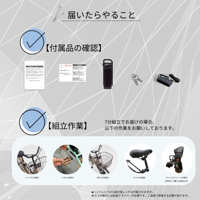 本商品は7分組立状態にてお届けさせて頂きます。 「前カゴ」「ペダル」「ハンドル」の取付や固定の作業が必要となりますので、予めご了承ください。 大型配送品の為、注文確定日からお届けまで平均1週間〜2週間前後お時間いただいております。