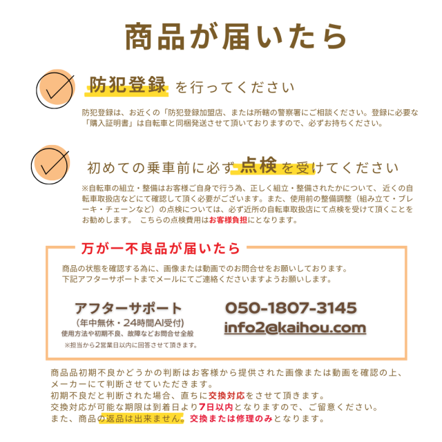 完全組立商品の場合でも、専門担当による車体点検対応を行っていない為、 近くの自転車取扱店などにて確認して頂く必要がございます。