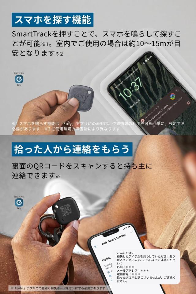 裏面のQRコードをスキャンすると持ち主に連絡できます。※「Eufy 」アプリでの登録と紛失モードをオンにする必要があります