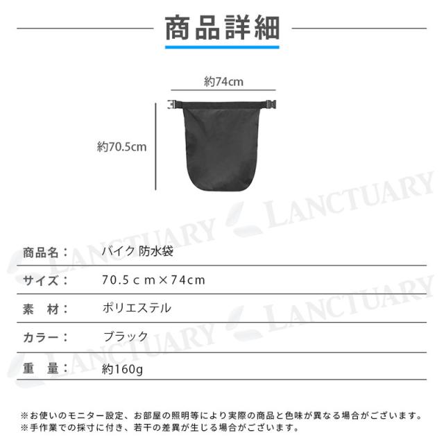 | 主な仕様 | 商品名: バイク 防水袋 サイズ: 70.5cm 74cm カラー:ブラック 素材: ポリエステル 重量: 160g |