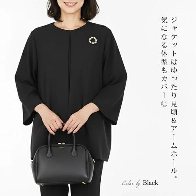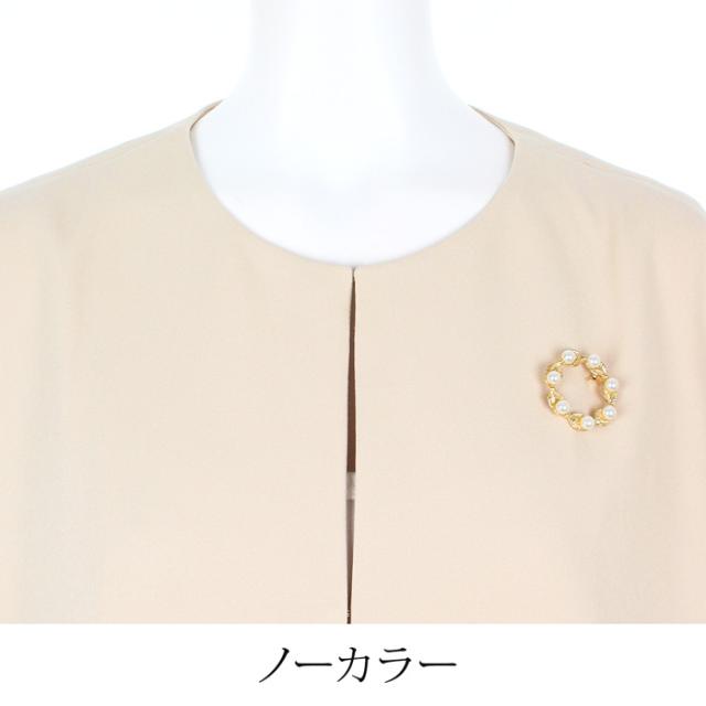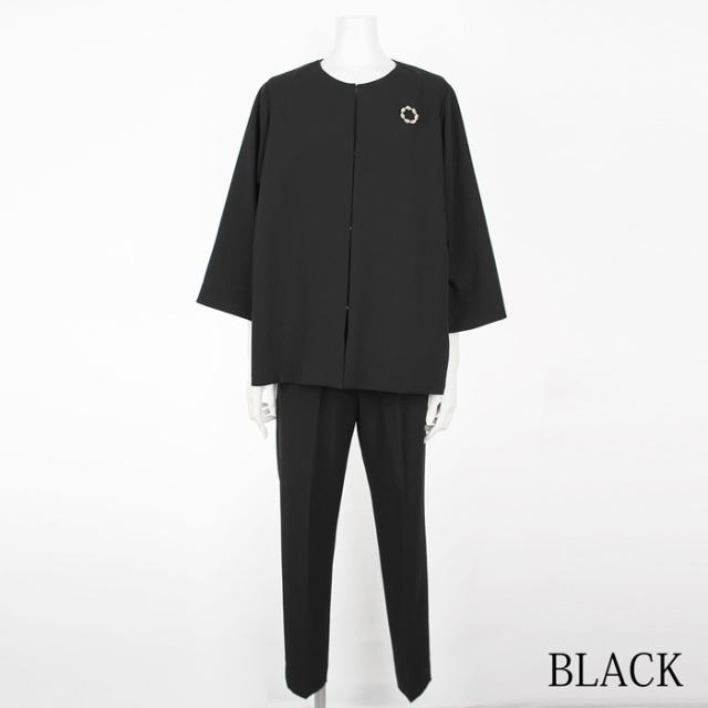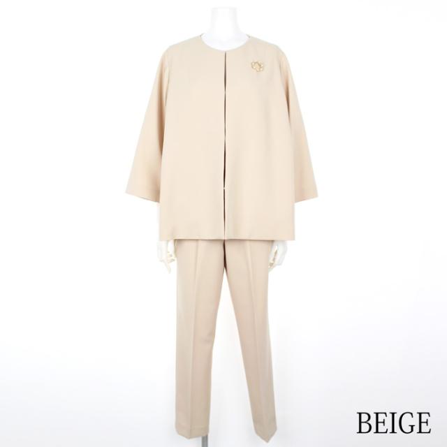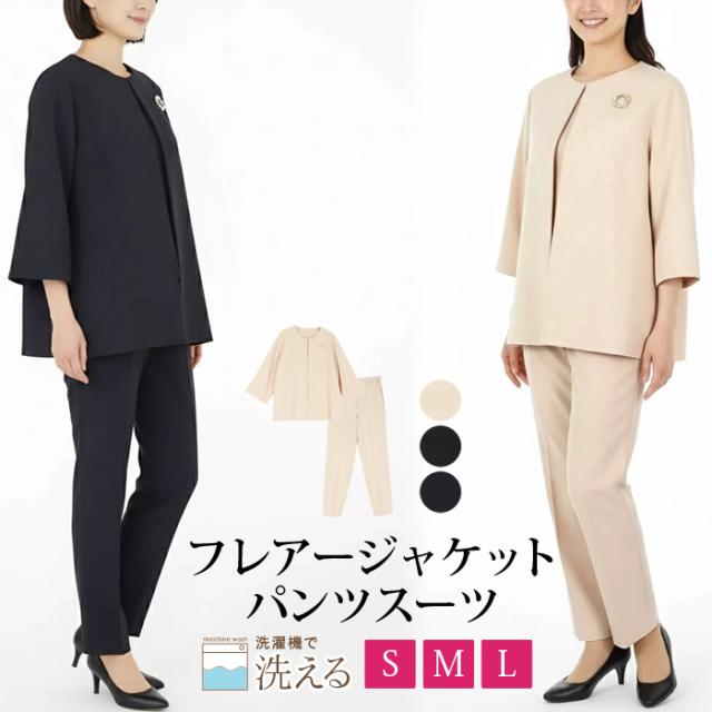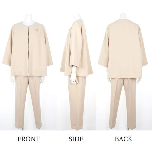 送料無料 パンツスーツ レディース ジャケット ボトムス ノーカラー フレアー SET ブローチ付き 洗える 七分袖 無地 ブラック ベージュ ネイビー[57215]