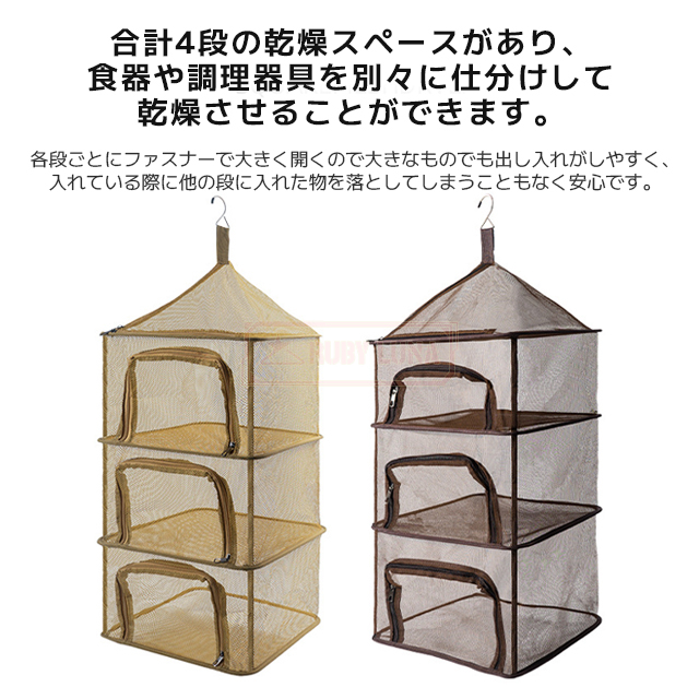 | 【たっぷり置ける四段構造】 | ◆合計4段の乾燥スペースがあり、食器や調理器具を別々に仕分けして乾燥させることができます。 ◆各段ごとにファスナーで大きく開くので大きなものでも出し入れがしやすく、入れている際に他の段に入れた物を落としてしまうこともなく安心です。 |