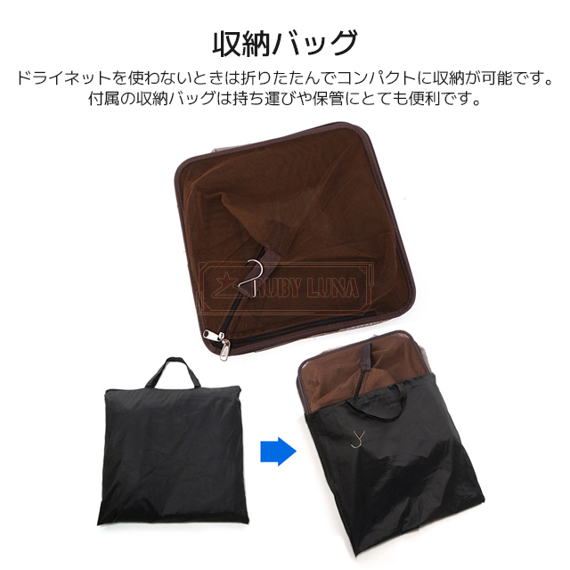 | 【コンパクトに収納可能】 | ◆ドライネットを使わないときは折りたたんでコンパクトに収納が可能。 ◆収納袋も付いているので収納すれば本体が汚れる心配もなく、簡単に持ち運びが可能です。 |