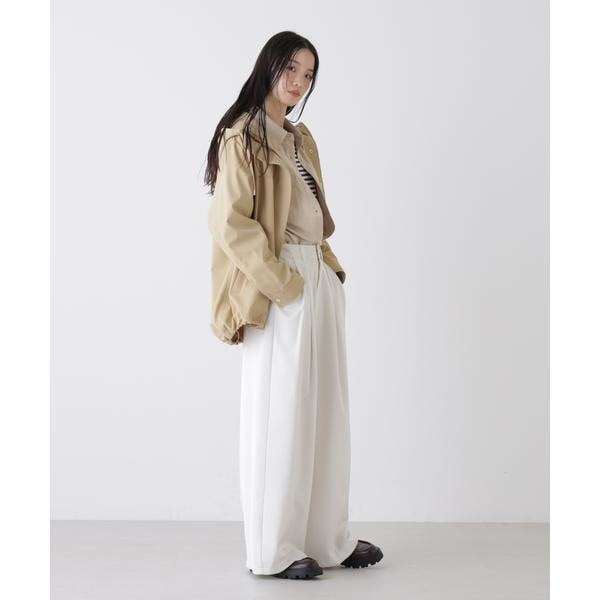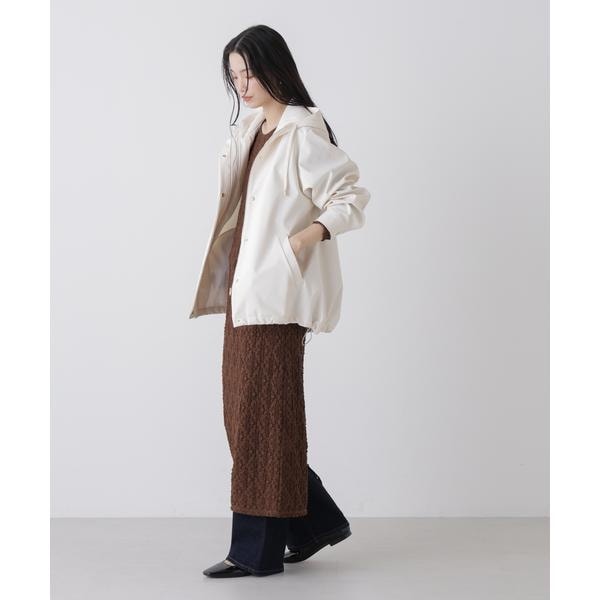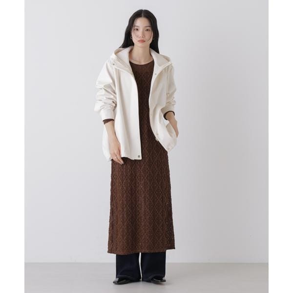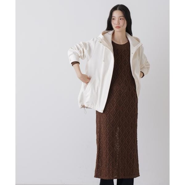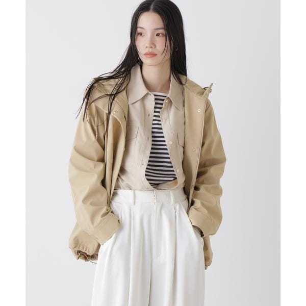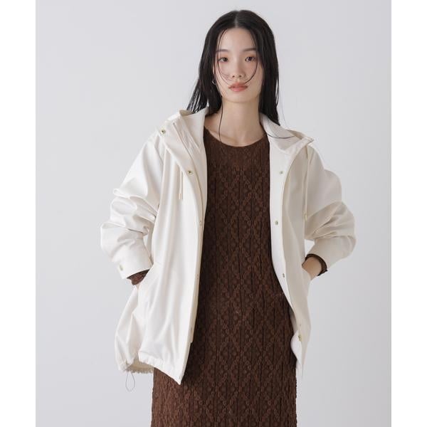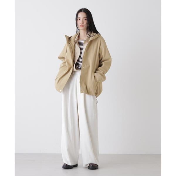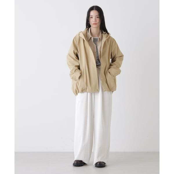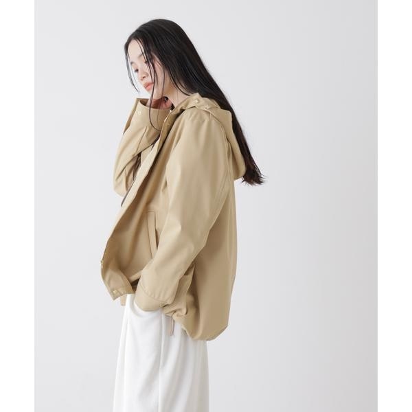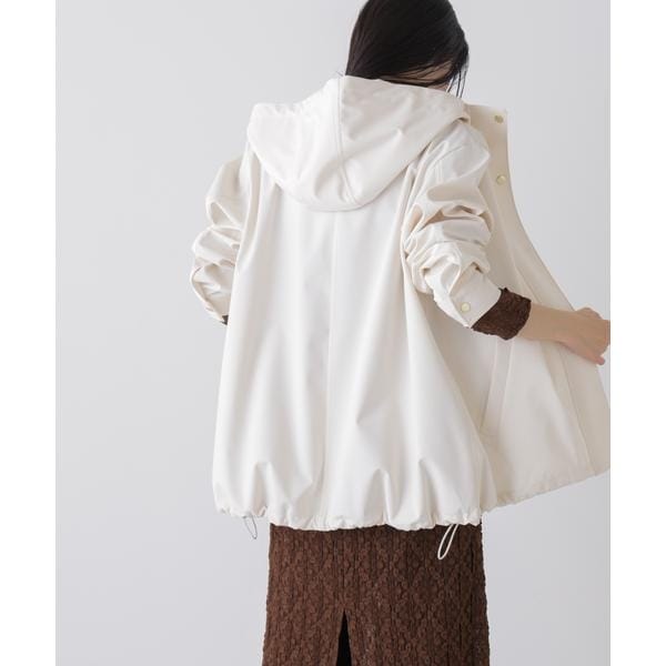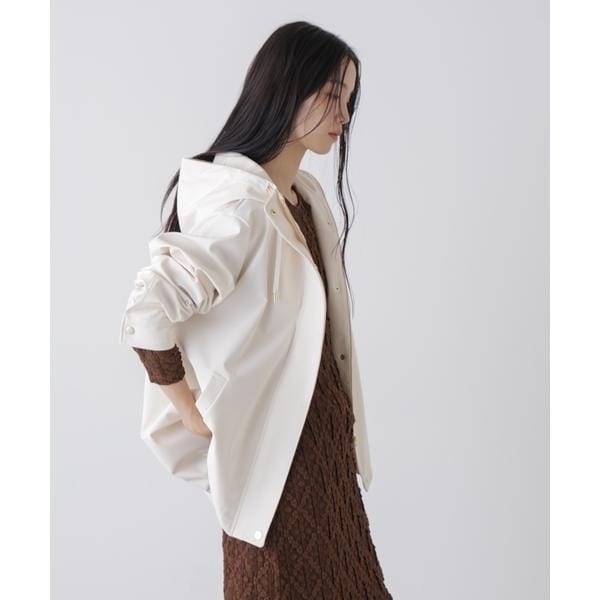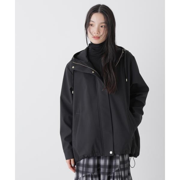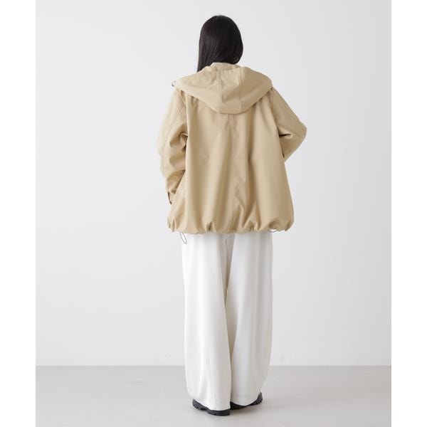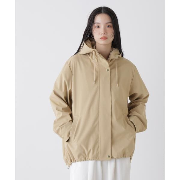 撥水&花粉ガードシリーズのフードブルゾン。撥水加工を施した高機能を備えており、天候を気にせず着用できるのも魅力。裾のドロストも調節できるので、Aラインにしたり裾を絞ったり、様々なシルエットの変化を楽しめる一枚です。