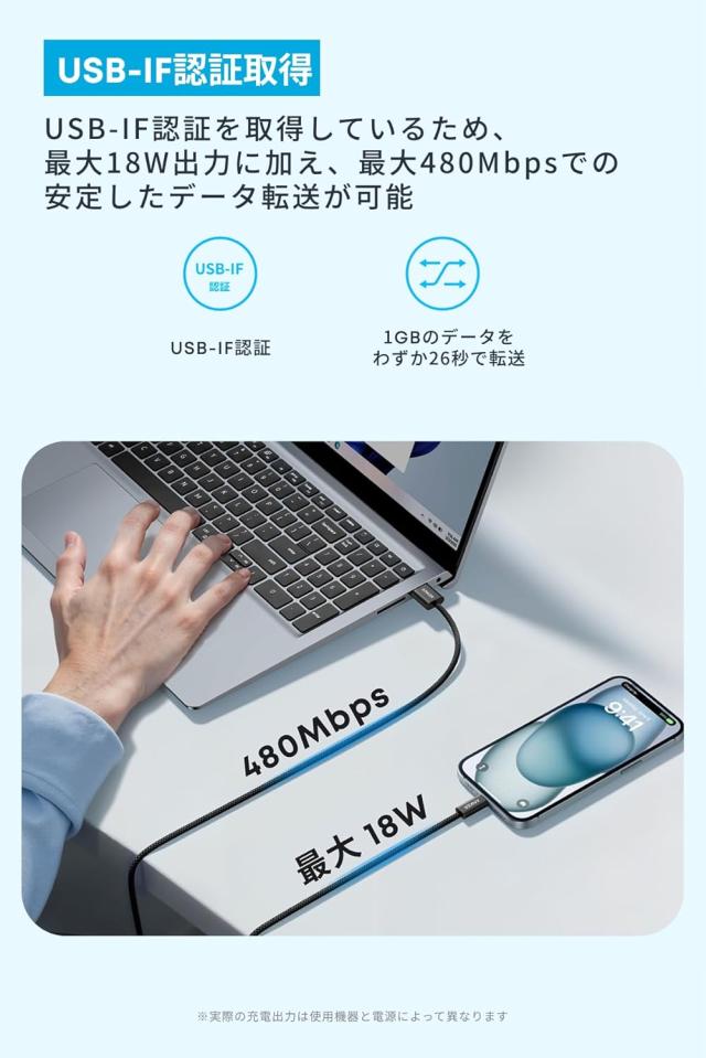 認証ケーブルで18Wの電力と480Mbpsのデータを安定的に供給可能