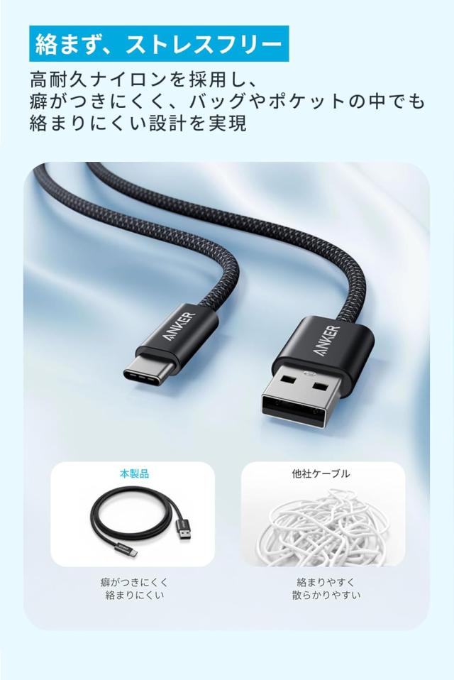| パッケージ内容 | Anker Zolo USB-C & USB-A ケーブル、シリコン製結束バンド、カスタマーサポート |
