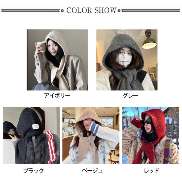 フード付きマフラー バラクラバ風 ニット フード付き マフラー ストール フーディーマフラー フードマフラー 大判ストール レディース バラクラバ ニット帽 マフラー一体型 ネックウォーマー ボリュームマフラー グレー アイボリー ベージュ ブラック レッド