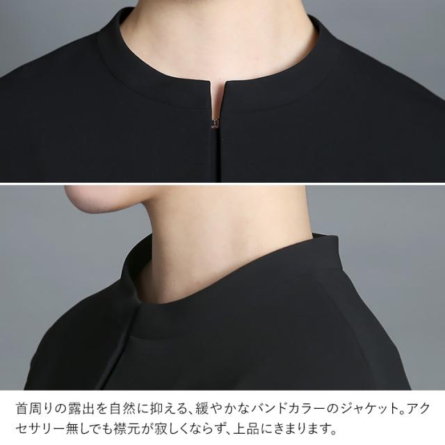 首周りの露出を自然に抑える、緩やかなバンドカラーのジャケット。アクセサリー無しでも襟元が寂しくならず、上品にきまります。