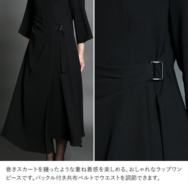 巻きスカートを纏ったような重ね着感を楽しめる、おしゃれなラップワンピースです。バックル付き共布ベルトでウエストを調節できます。
