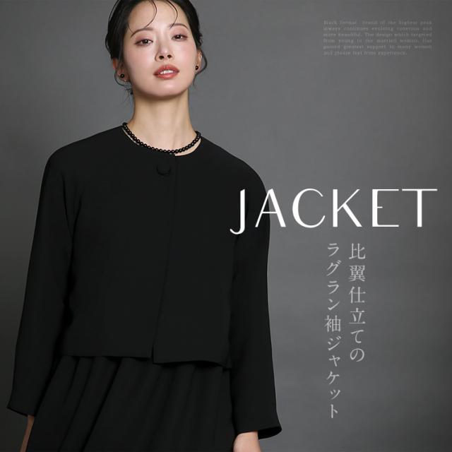 襟元のくるみボタン以外はすっきりと内側に隠せる、上品な比翼仕立て仕様のノーカラージャケット。肩に切替えが無く、肩幅を気にせず着られるラグラン袖です。