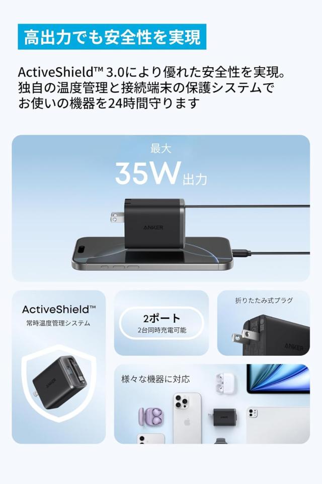 | パッケージ内容 | Anker Nano Charger (35W, 巻取り式 USB-Cケーブル)、最大30ヶ月保証、カスタマーサポート、取扱説明書 |