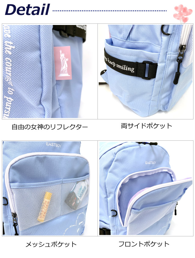 ■イメージ・その他:おしゃれ お洒落 おすすめ 人気 通販 柄 かわいい 可愛い 黒 ブラック ピンク 紫 パープル 緑 ミント グリーン 水色 ブルー ハート A4 サブバッグ b5サイズ対応 a4サイズ収納 ブランド イーストボーイリュック バッグ リフレクター 反射材 チェストベルト 誕生日プレゼント クリスマスプレゼント