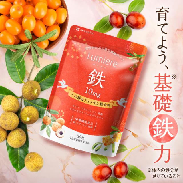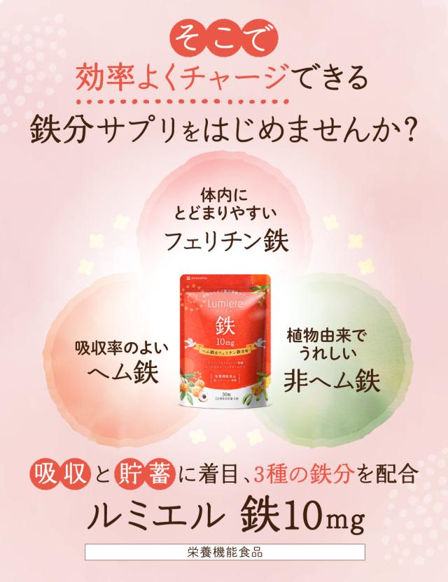 そこで、吸収と貯蓄に着目。3種の鉄分を配合した「ルミエル 鉄分10mg」で効率よくチャージできる鉄分サプリ習慣をはじめませんか?